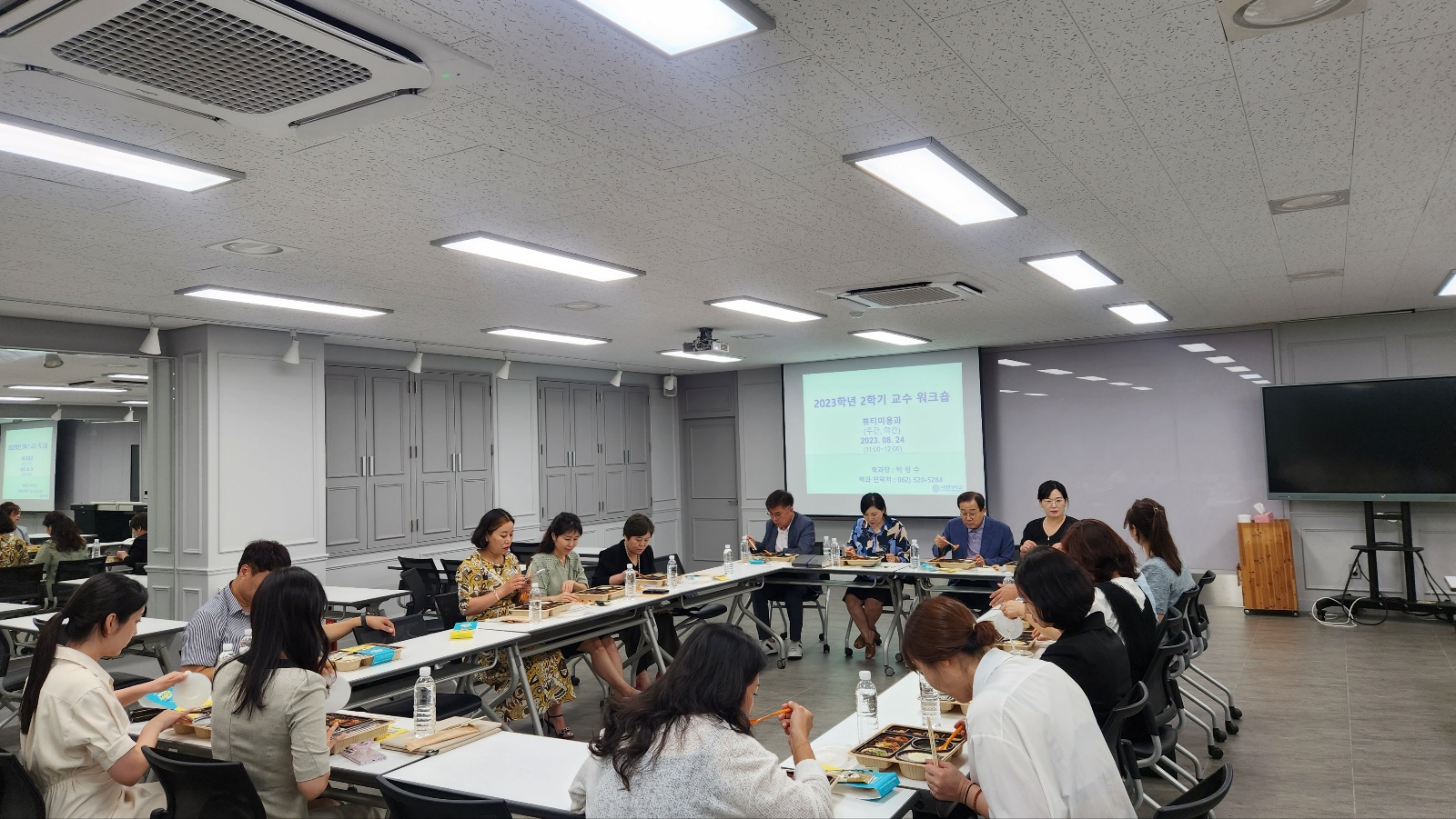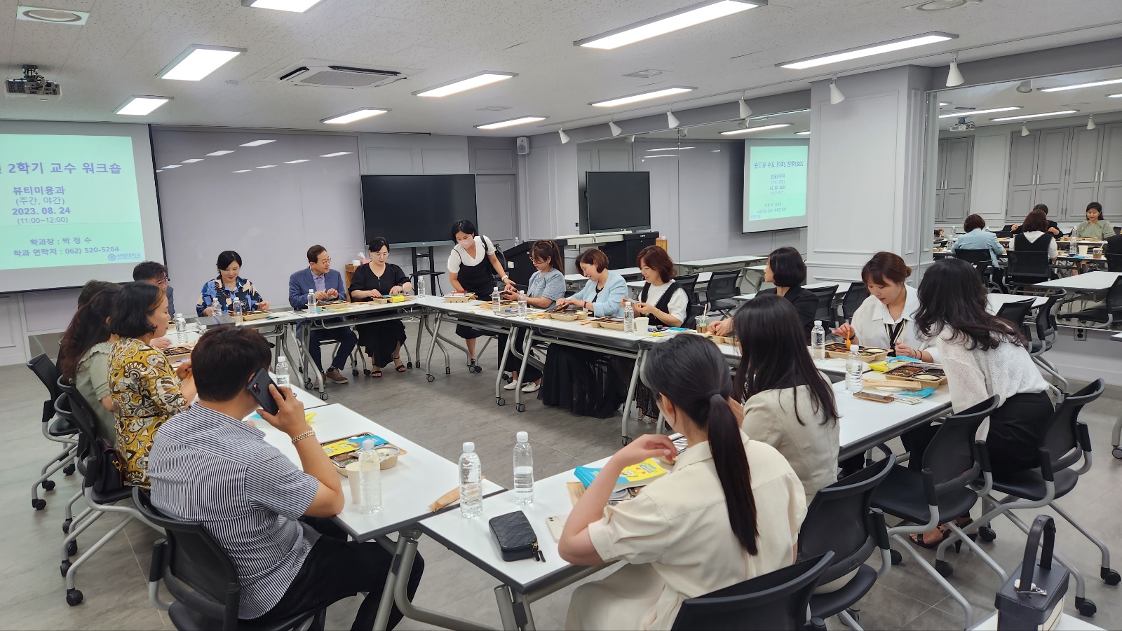 ○ 2학기 개강 준비를 위해 학과장님을 비롯해 교수님들과 간담회 겸 워크숍이 토탈뷰티실에서 진행이 되었다.
