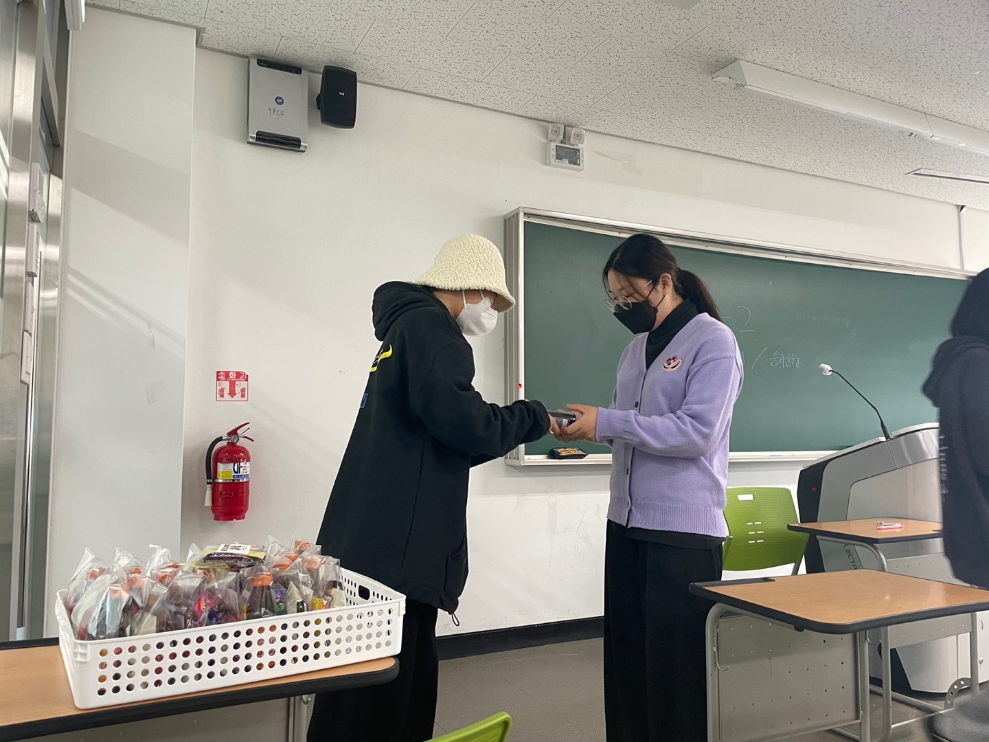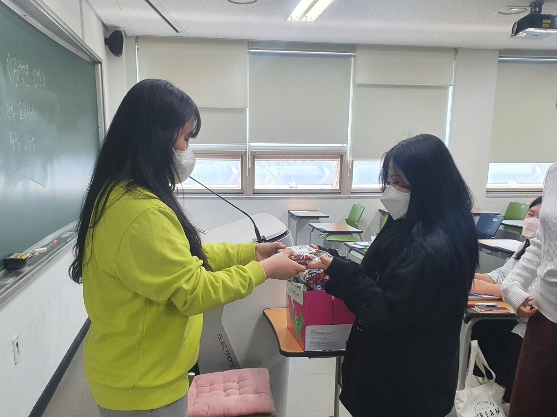간식선물은 중간고사 기간동안 각 반 대표들을 통해 전달하였습니다.