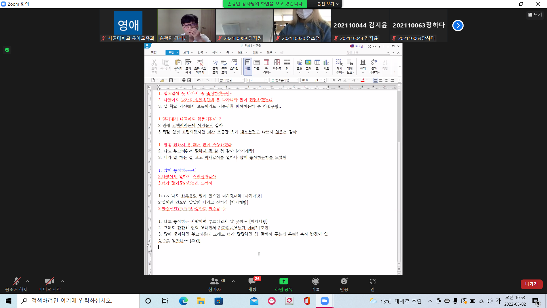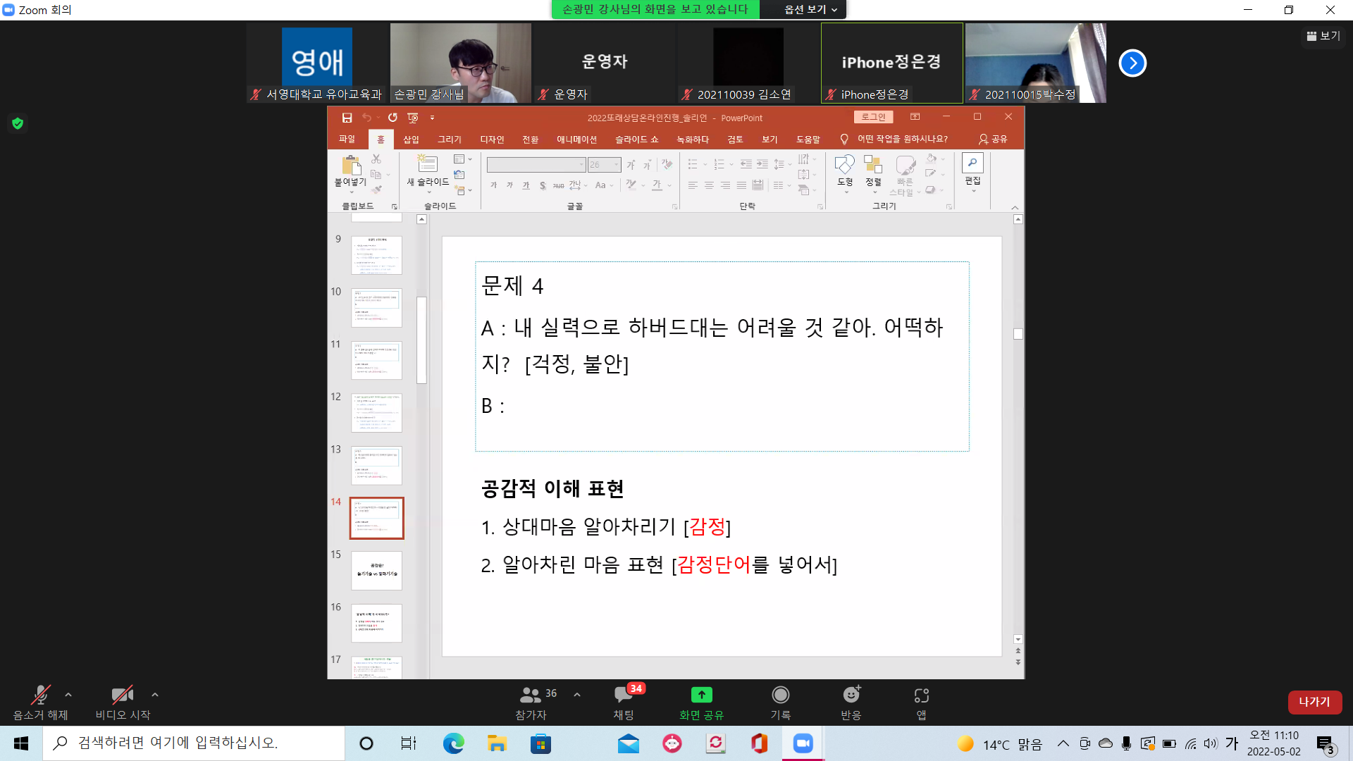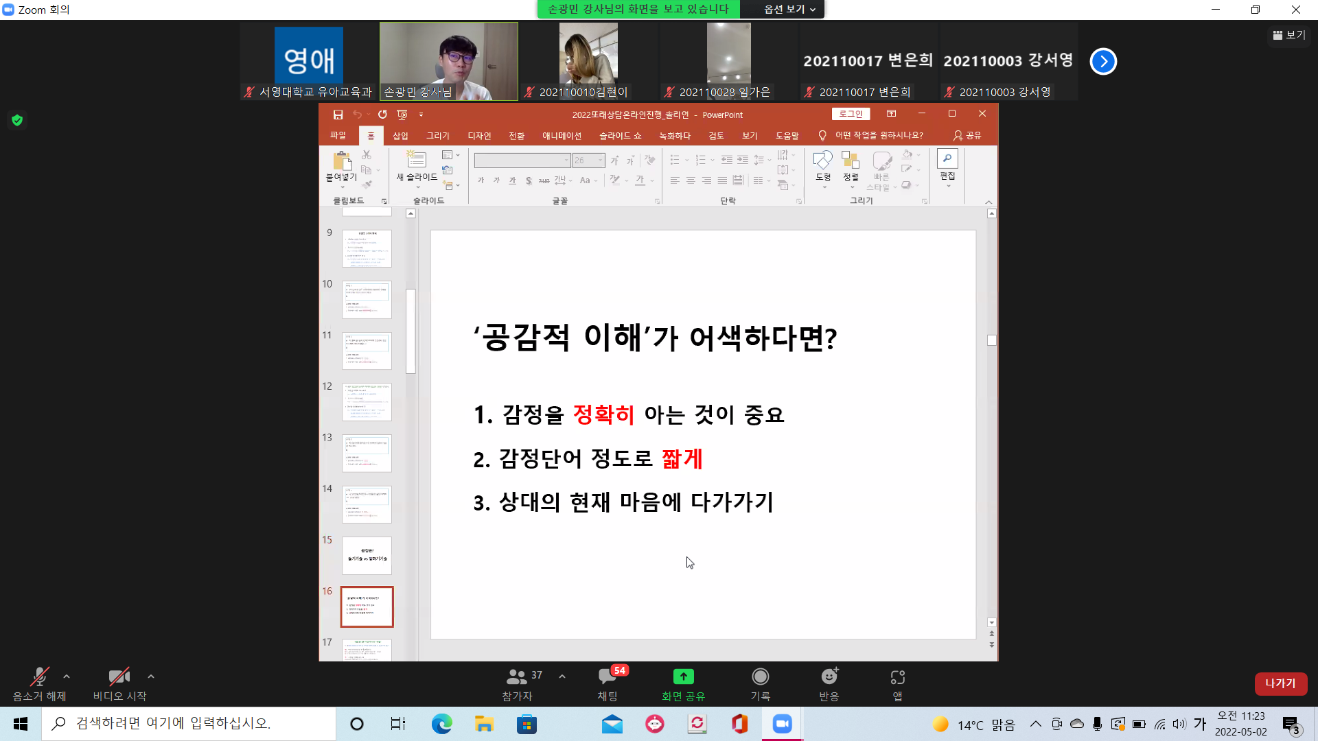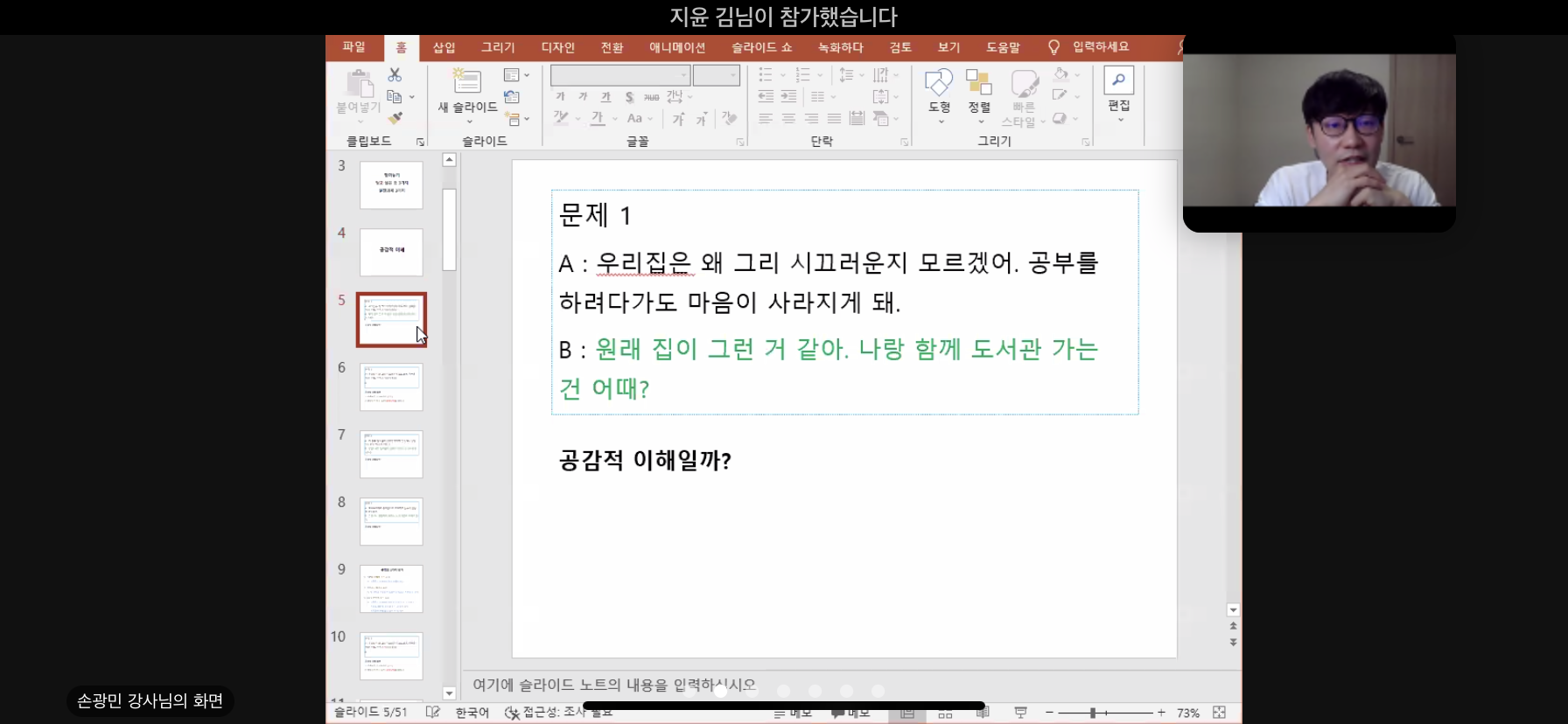 - 내용 : 공감에 대한 종류와 구체적인 내용, 그리고 해당 상황에 대한 올바른 공감 방법에 대해서 배우고 생각을 해보는 시간을 가졌습니다. 여러 공감에 대한 동영상 자료를 보며 실생활에 적용하는 방법에 대해서 알아보고 적용해보는 시간을 가지며 특강을 마무리하였습니다.