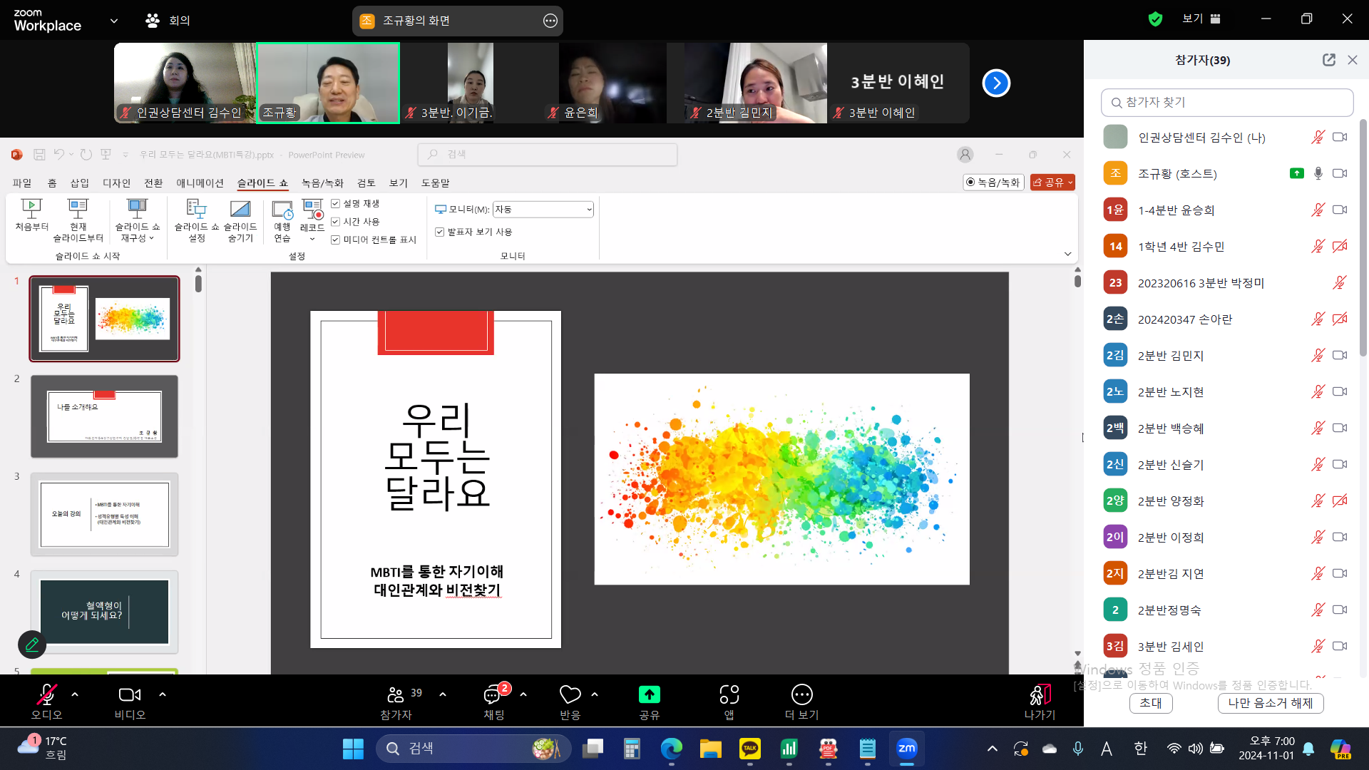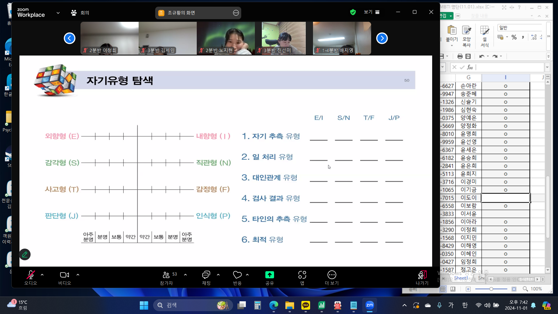 - 내용 : MBTI 성격 유형 검사를 통하여 자신의 선천적 선호 경향성을 알아보는 심리검사를 진행하였습니다. 검사지 속 문항에 체크하며 자신의 MBTI를 알아보고, 자신의 유형에 관한 글을 읽어보며 이야기나누는 시간을 가졌습니다.
