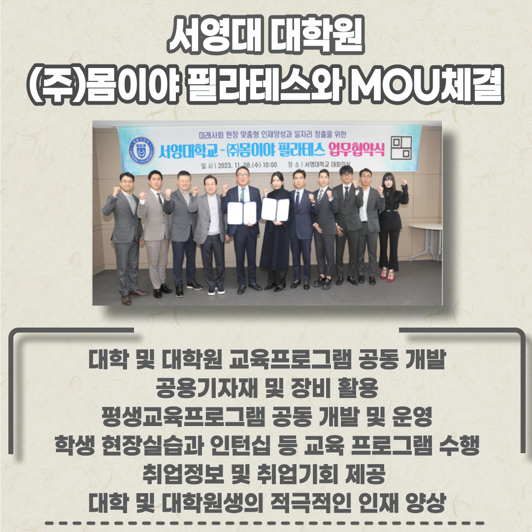 ○ 서영대학교(총장 김정수)는 11월 8일 ㈜몸이야 필라테스와 산학 업무협약을 체결하였다. ㈜몸이야 필라테스는 전국에 17개의 지점을 보유하고 있으며, 필라테스 지도자교육 및 필라테스를 통한 체형 교육을 운영하고 있다. ○ 이번 협약을 통해 양 기관은 보건, 헬스 분야 등 관련 분야 상생발전 및 산업의 활성화을 위하여 ▲대학 및 대학원 교육프로그램 공동 개발 ▲공용기자재 및 장비 활용 ▲평생교육프로그램 공동 개발 및 운영 ▲학생 현장실습과 인턴십 등 교육 프로그램 수행 ▲취업정보 및 취업기회 제공 등 대학 및 대학원생의 적극적인 인재양상을 위해 상호협력하기로 하였다. ○ 송요한 물리치료과학과장은 “필라테스는 물리치료를 기반으로 몸 손상의 악화 방지, 몸 구조에 따른 운동강도조절, 몸 구조에 따른 운동시기결정, 몸 구조에 따른 특성 파악 등이 가능하다. 이번 협약을 통해 전문학사 뿐 아니라 대학원에서도 더 나은 교육과정을 운영할 수 있고, 우수인재 양성을 위한 좋은 발판을 마련하여 더 나은 고숙련 기술을 숙련할 수 있게 되어 기쁘다”고 전했다. ○ 윤민이 대표이사는 “필라테스는 몸의 구조에 맞는 운동방법을 통하여 질환을 예방하고 운동성이 회복되는 것이며, 몸 구조의 손상된 부위에 과도한 동작을 하지 않으면서 회복시키는 운동을 할 수 있다. 서영대와 협력해 필라테스를 통한 지역의 재활분야를 선도하며 지역사회와 함께 성장하는 기업이 되겠다"고 말했다.