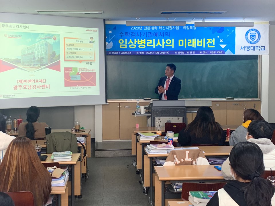 임상병리과에서는 2020년 3학년을 대상으로 취업역량을 강화하기 위한 혁신지원사업-취업특강을 서강관 309호 강의실에서 실시하였다.