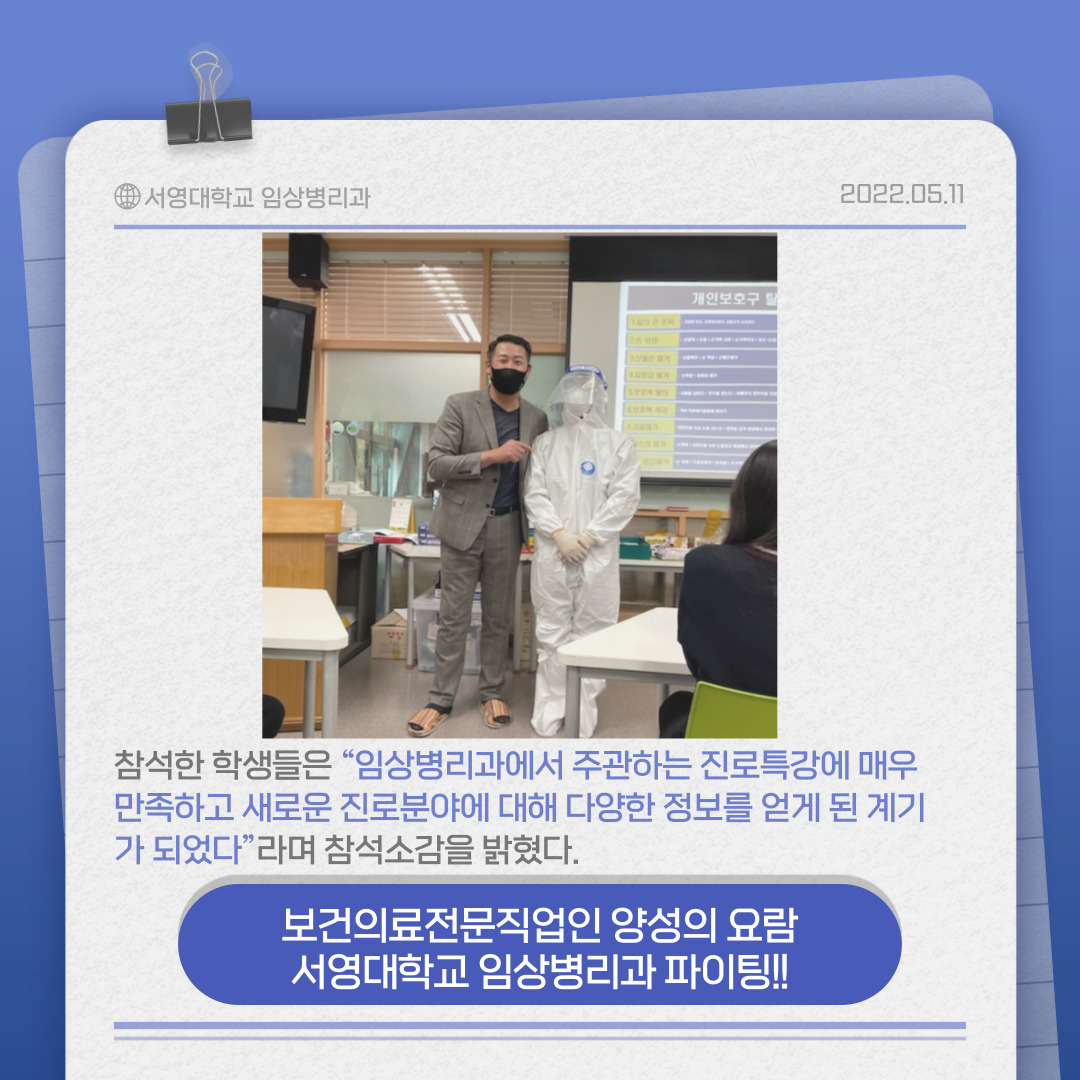 참석한 학생들은 “임상병리과에서 주관하는 진로특강에 매우 만족하고 새로운 진로분야에 대해 다양한 정보를 얻게 된 계기가 되었다”라며 참석소감을 밝혔다.