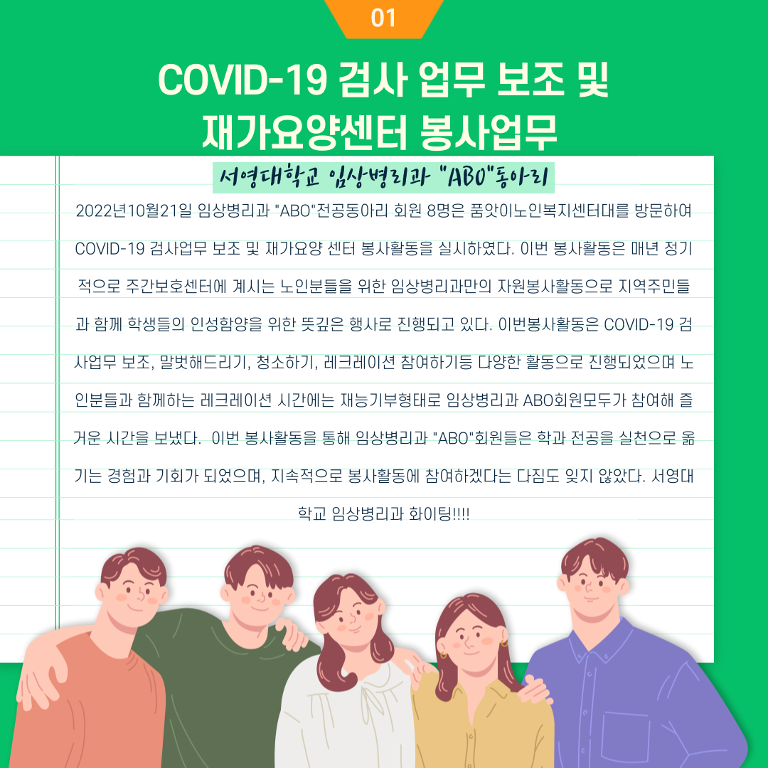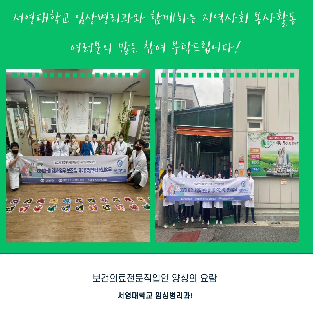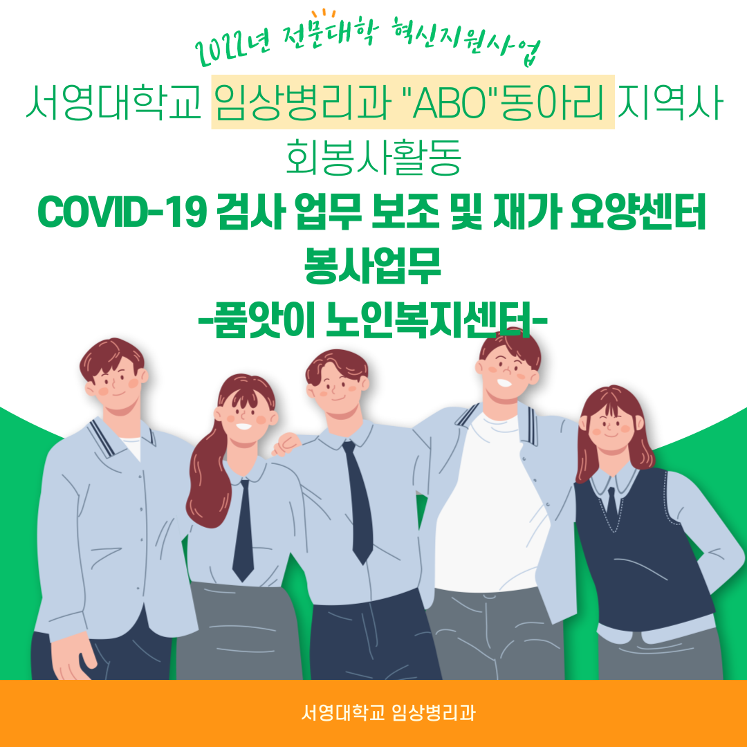2022년 10월 21일 임상병리과 “ABO” 전공동아리 회원 8명은 품앗이노인복지센터대를 방문하여 COVID-19 검사업무 보조 및 재가요양 센터 봉사활동을 실시하였다. 이번 봉사활동은 매년 정기적으로 주간보호센터에 계시는 노인분들을 위한 임상병리과만의 자원봉사활동으로 지역주민들과 함께 학생들의 인성함양을 위한 뜻깊은 행사로 진행되고 있다. 이번봉사활동은 COVID-19 검사업무 보조, 말벗해드리기, 청소하기, 레크레이션 함께 참여하기 등 다양한 활동으로 진행되었으며 노인분들과 함께하는 레크레이션 시간에는 재능기부형태로 임상병리과 ABO 회원 모두가 참여해 즐거운 시간을 보냈다. 이번 봉사활동을 통해 임상병리과 “ABO” 회원들은 학과 전공을 실천으로 옮기는 경험과 기회가 되었으며, 지속적으로 봉사활동에 참여하겠다는 다짐도 잊지 않았다. 서영대학교 임상병리과 파이팅!!
