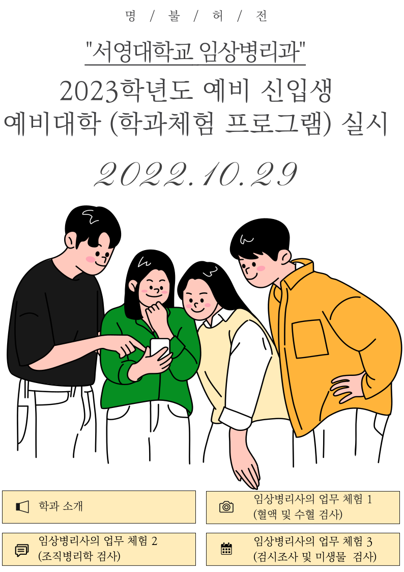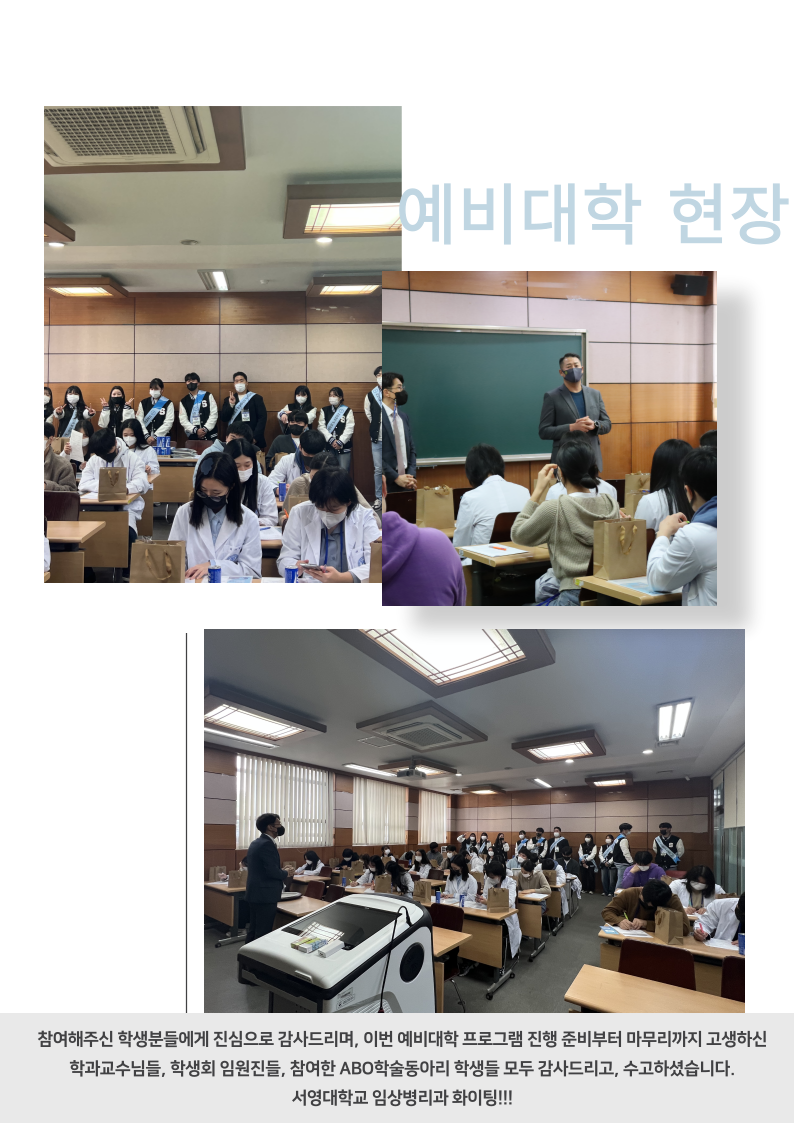 2023학년도 수시1차 지원자들을 대상으로 예비대학 프로그램을 10월 29일 진행하였습니다. 예비대학 프로그램에서는 학과소개, 교수님 소개, 학과의 장점 및 비전을 안내하였고, 각 실습실에서 임상병리사의 업무(혈액 및 수혈 검사, 조직병리학검사, 미생물검사, 검시조사)를 직접 시연하고, 학생들이 직접 체험해 볼 수 있는 기회를 마련하였습니다. 분야별 검사의 체험활동은 교수님들 지도하에 ABO 학술동아리 학생들이 참여하여 더욱 더 큰 의미가 있었습니다. 예비대학 프로그램에 참여한 학생들에게는 소정의 선물 및 간식도 제공하였고, 학생들의 만족도도 매우 높았습니다. 이번 예비대학 학과 체험 프로그램은 안전수칙을 이행하여 아무 탈 없이 성황리에 성공적으로 마무리 되었습니다. 참여해주신 학생분들 에게 진심으로 감사드리며, 이번 예비대학 프로그램 진행 준비부터 마무리까지 고생하신 학과교수님들, 학생회 임원진들, 참여한 ABO 학술동아리 학생들 모두 감사드리고, 수고하셨습니다. 서영대학교 임상병리과 화이팅!!!