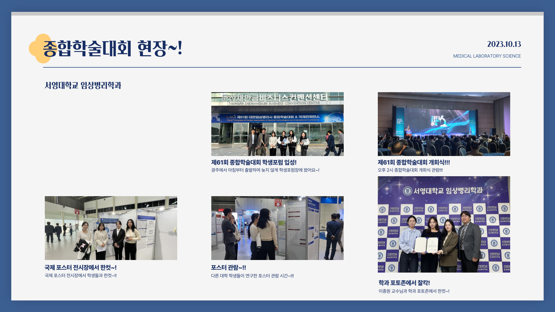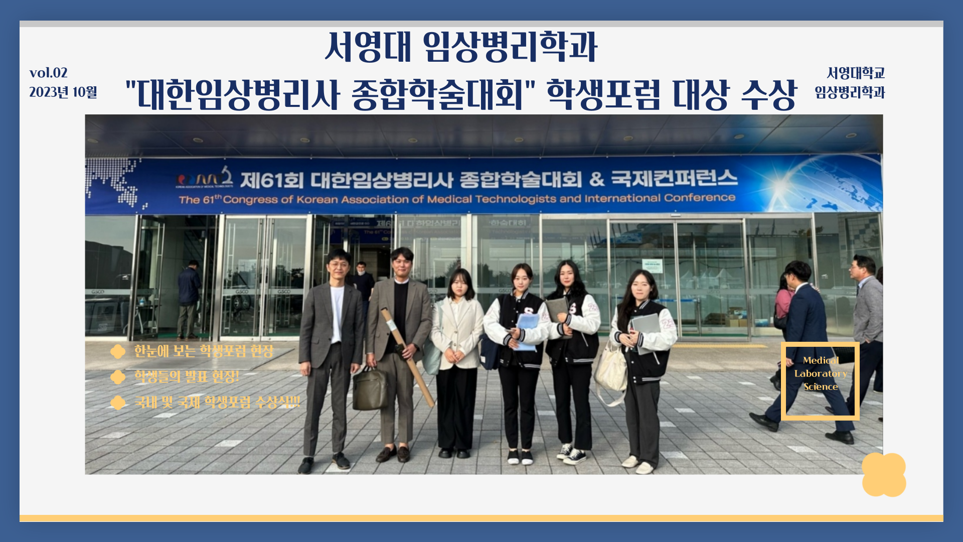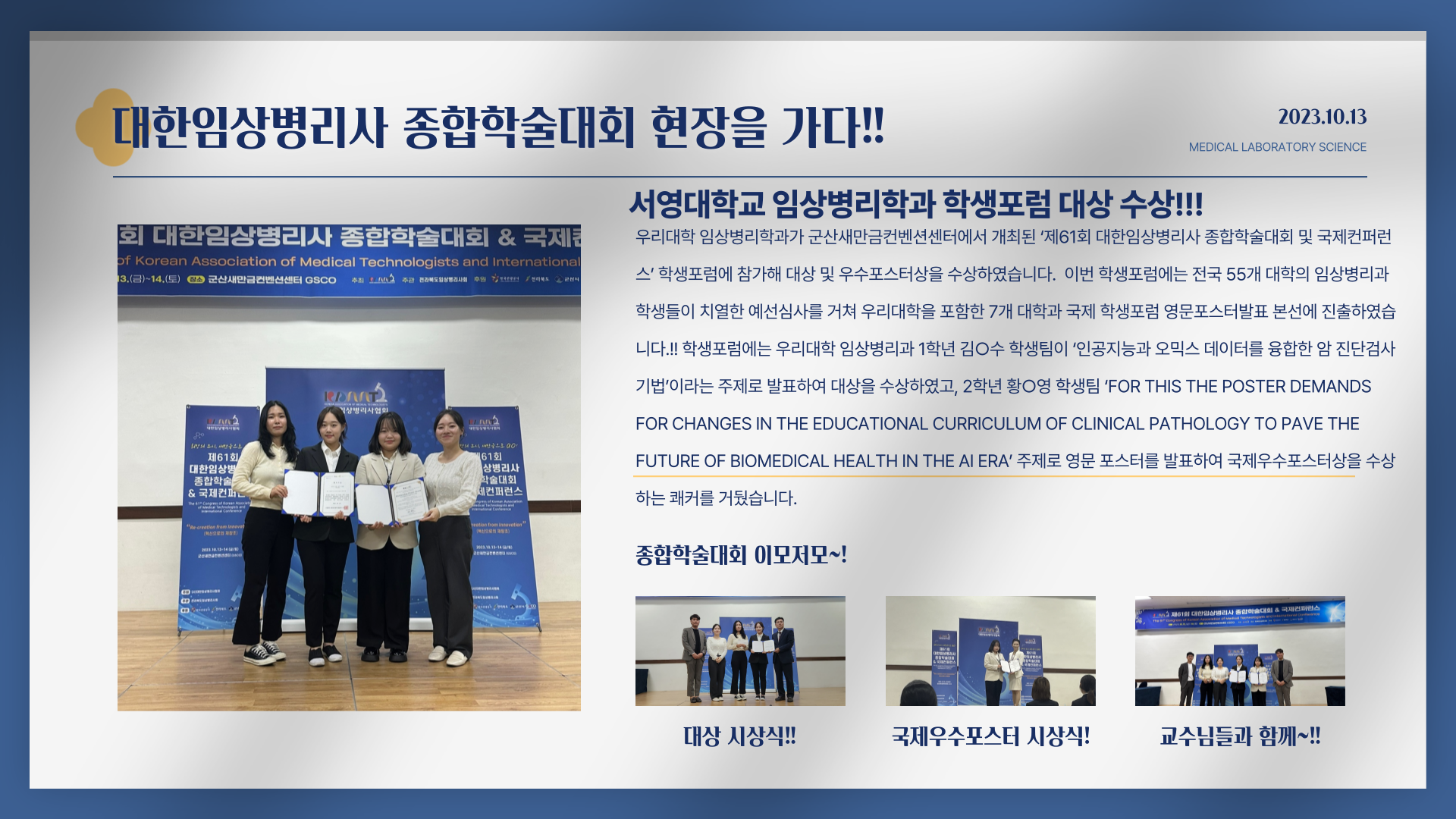 우리대학 임상병리학과가 군산새만금컨벤션센터에서 개최된 ‘제61회 대한임상병리사 종합학술대회 및 국제컨퍼런스’ 학생포럼에 참가해 대상 및 우수포스터상을 수상하였습니다.