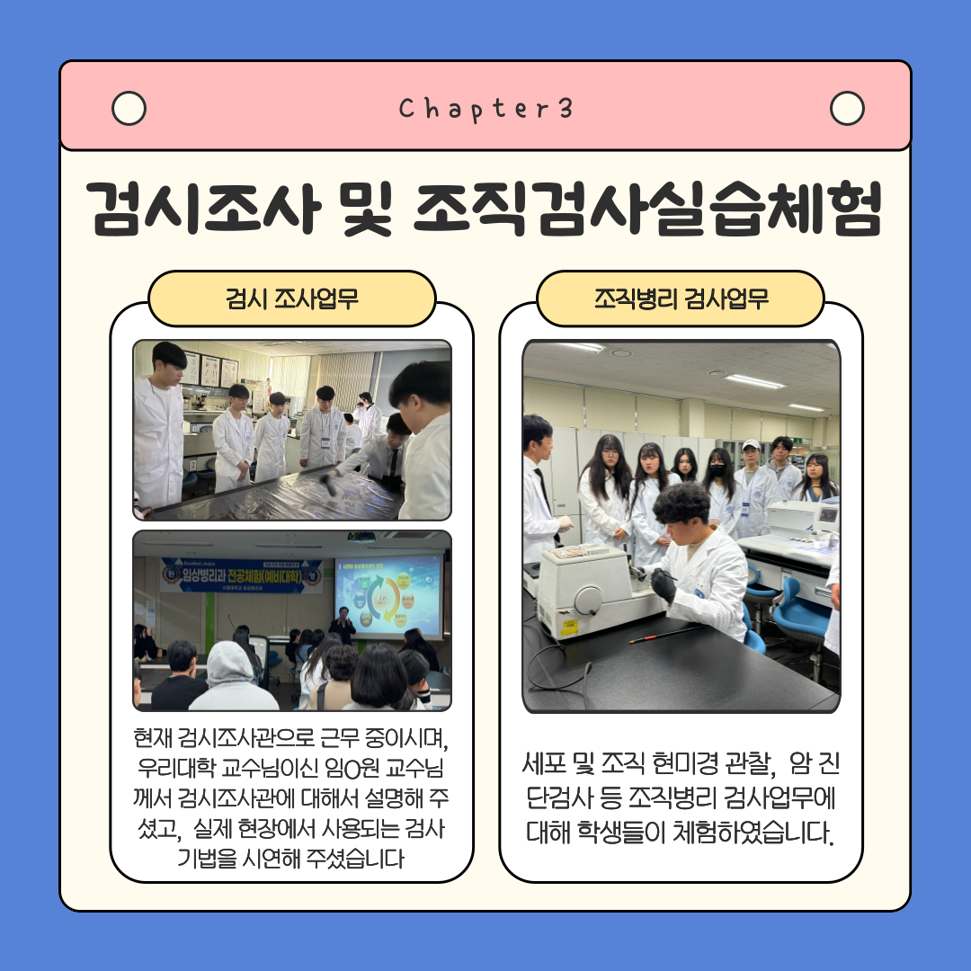 각 실습실에서 임상병리사의 업무(혈액 및 수혈 검사, 조직병리학검사, 미생물검사, 검시조사)를 직접 시연하고, 학생들이 직접 체험해 볼 수 있는 기회를 마련하였습니다. 분야별 검사의 체험활동은 교수님들 지도하에 미생물, 신경생리, 혈액 학술동아리 학생들이 참여하여 더욱 더 큰 의미가 있었습니다. 예비대학 프로그램에 참여한 학생들에게는 소정의 선물 및 간식도 제공하였고, 학생들의 만족도도 매우 높았습니다. 이번 예비대학 학과 체험 프로그램은 안전수칙을 이행하여 아무 탈 없이 성황리에 성공적으로 마무리 되었습니다. 참여해주신 학생분들 에게 진심으로 감사드리며, 이번 예비대학 프로그램 진행 준비부터 마무리까지 고생하신 학과교수님들, 학생회 임원진들, 참여한 학술동아리 학생들 모두 감사드리고, 수고하셨습니다.