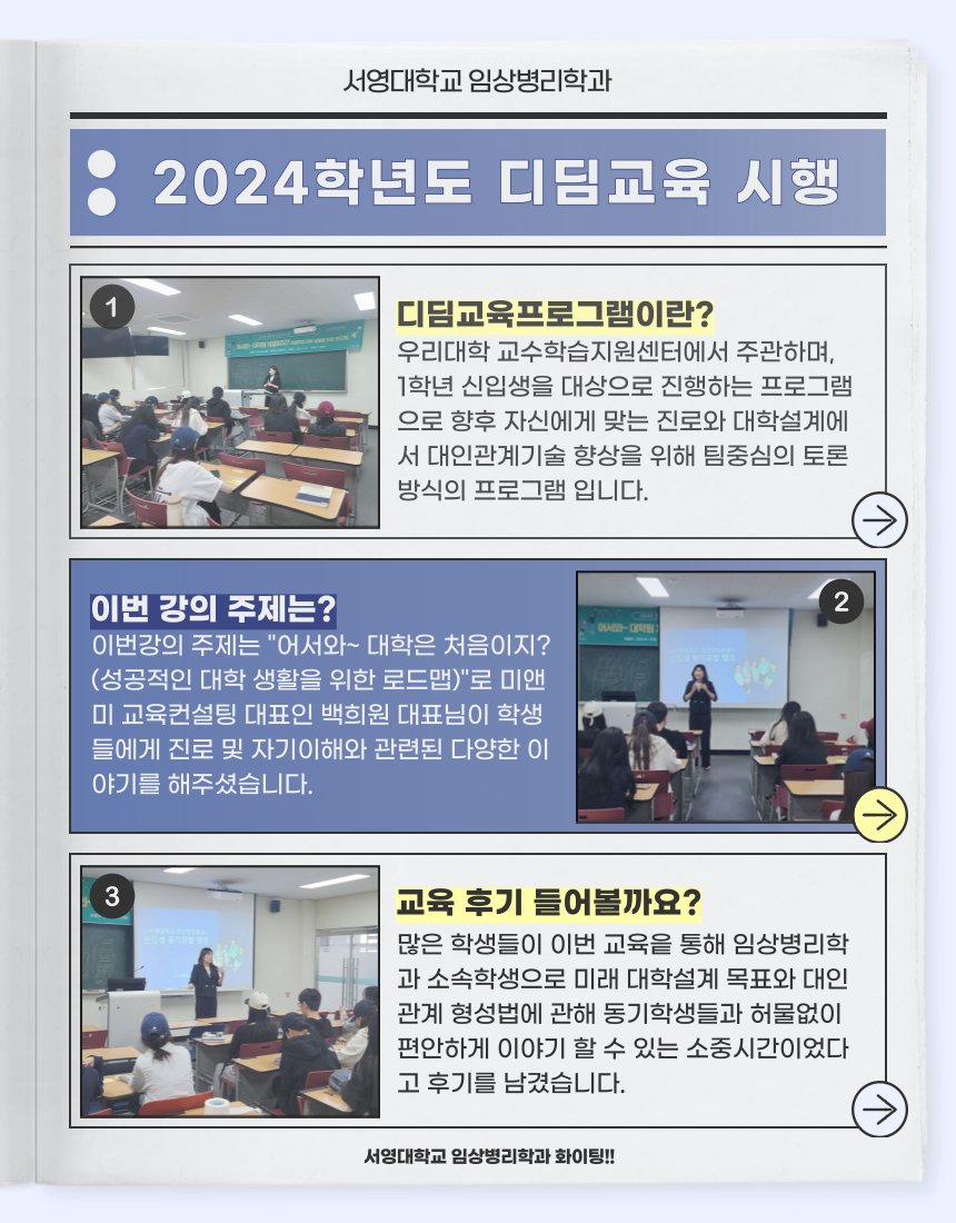 -내용: 성공적인 대학생활을 위한 로드맵으로 학생들에게 진로 및 자기이해와 관련된 다양한 방법을 알수있는 유익한 시간이 되었습니다.