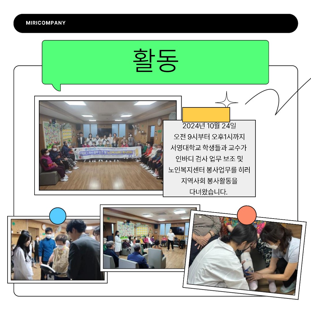 2024년 10월 24일 임상병리과 1학년 미생물 전공동아리 회원 4명의 학생들이 신바람노인복지센터를 방문하여 어르신 건강검사보조와 봉사활동을 실시하였습니다. 이번 봉사활동은 매년 정기적으로 주간보호센터에 계시는 노인분들을 위한 임상병리과만의 자원봉사활동으로 지역주민들과 함께 학생들의 인성함양을 위한 뜻깊은 행사로 진행하고 있습니다. 이번 봉사활동은 어르신의 건강을 위해 인바디 검사와 노인 복지프로그램 보조 등 다양한 활동으로 진행되었습니다.