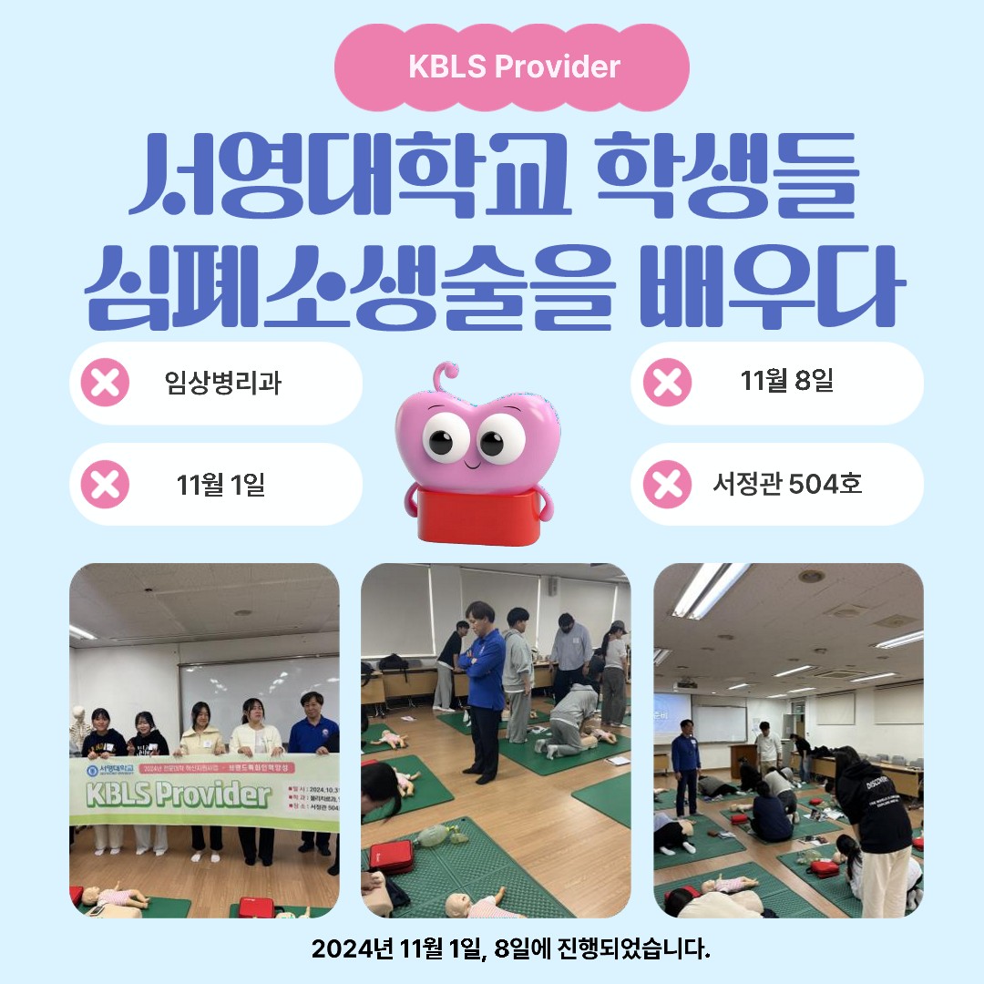 BLS Provider과정은 어느 곳에서나 발생할 수 있는 심장정지 상태나 기도폐색을 정확하고 빠르게 인지하고 가슴압박과 자동심장충격기 사용 등을 통해 대상자의 생존율을 높이고자 하는 지식과 기술이 병행된 훈련과정입니다.서영대학교 임상병리과BLS-provider자격을 취득한 학생 모두가 면허 취득 후 우수한  병원에 취업했으면 좋겠습니다~!