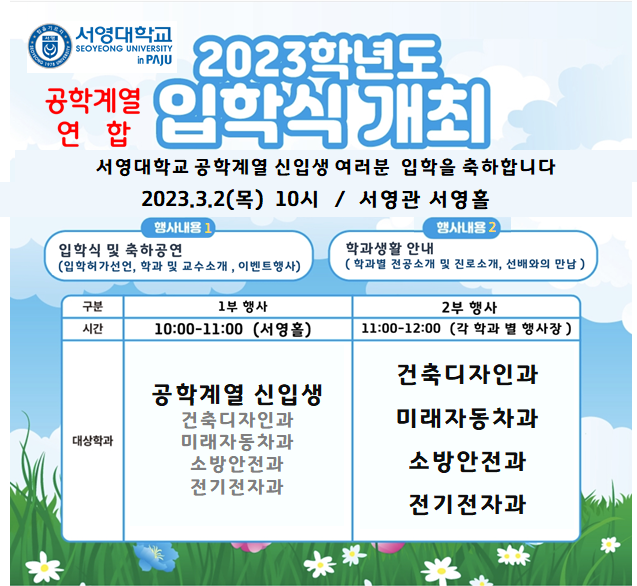 23학년도 신입생 3월 2일 오전 10시 입학식 안내