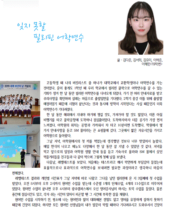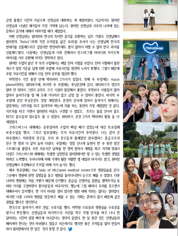 올해는 코로나 19로 인해 연수가 진행되지 못하였으나, 코로나 19가 종료가 되면 어학연수의 기회가 주어지겠지요^^