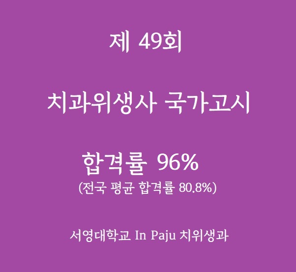 서영대학교 파주캠퍼스 치위생과는 '제 49회 치과위생사 국가고시'에서 96%의 합격률을 기록했습니다.