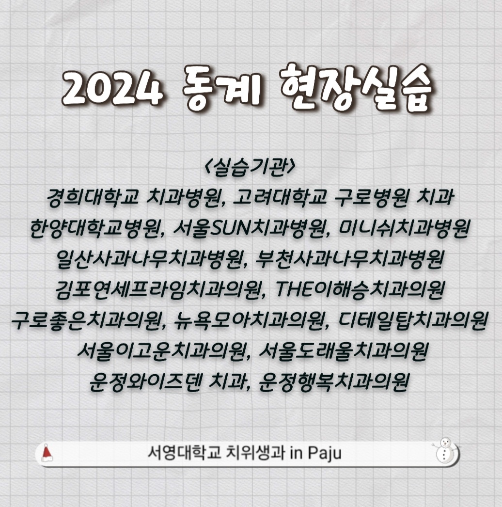 2024.12.23. ~ 2025.1.31 (6주간)경희대학교 치과병원, 고려대학교 구로병원 치과, 한양대학교병원, 서울SUN치과병원, 미니쉬치과병원 등 17곳의 치과 병, 의원에서 동계 현장실습이 진행되었습니다 ^^아래의 링크를 통하여 영상을 확인하세요 ^^https://youtube.com/shorts/ZVAMXDGqsYg?feature=shared