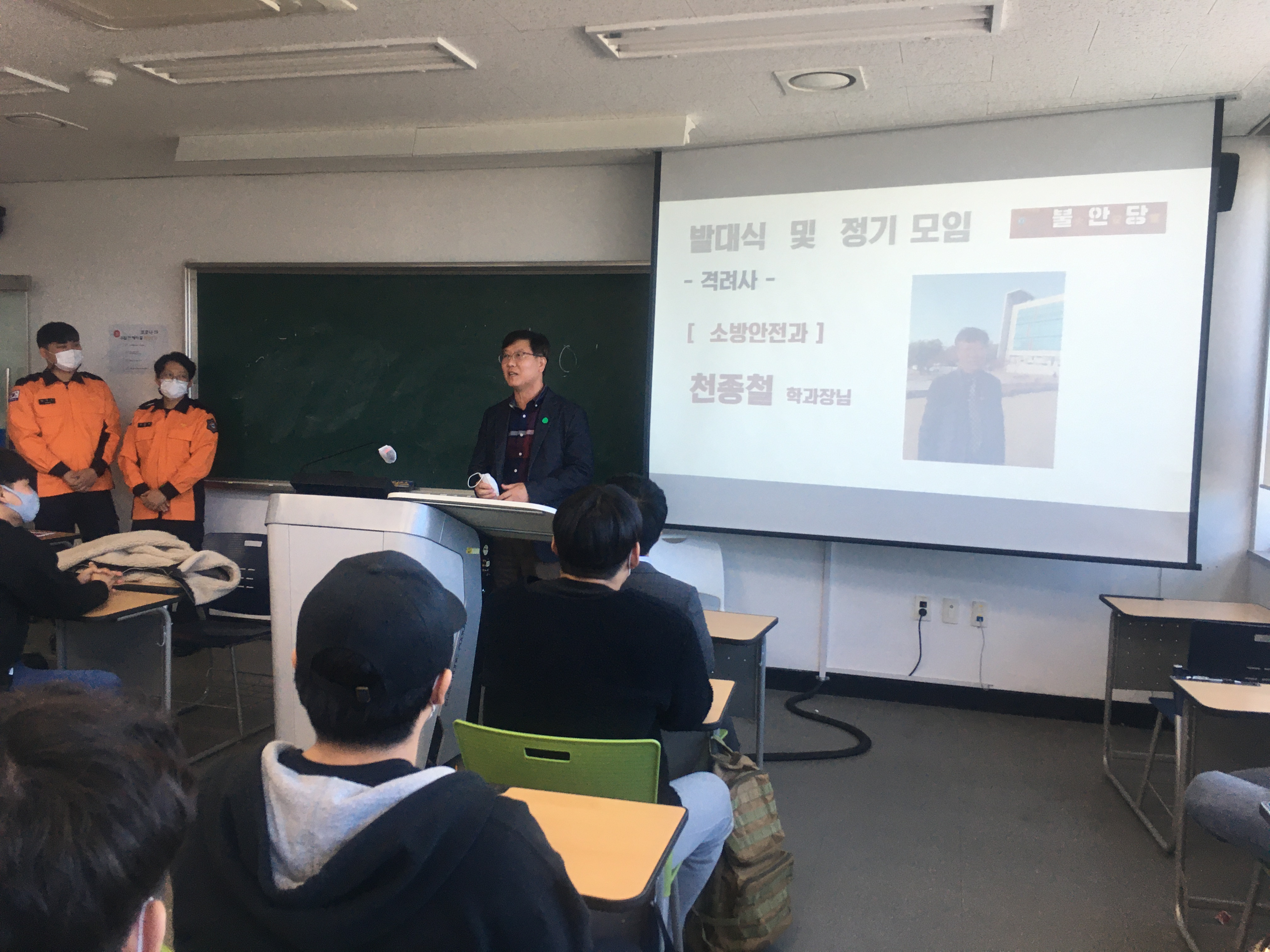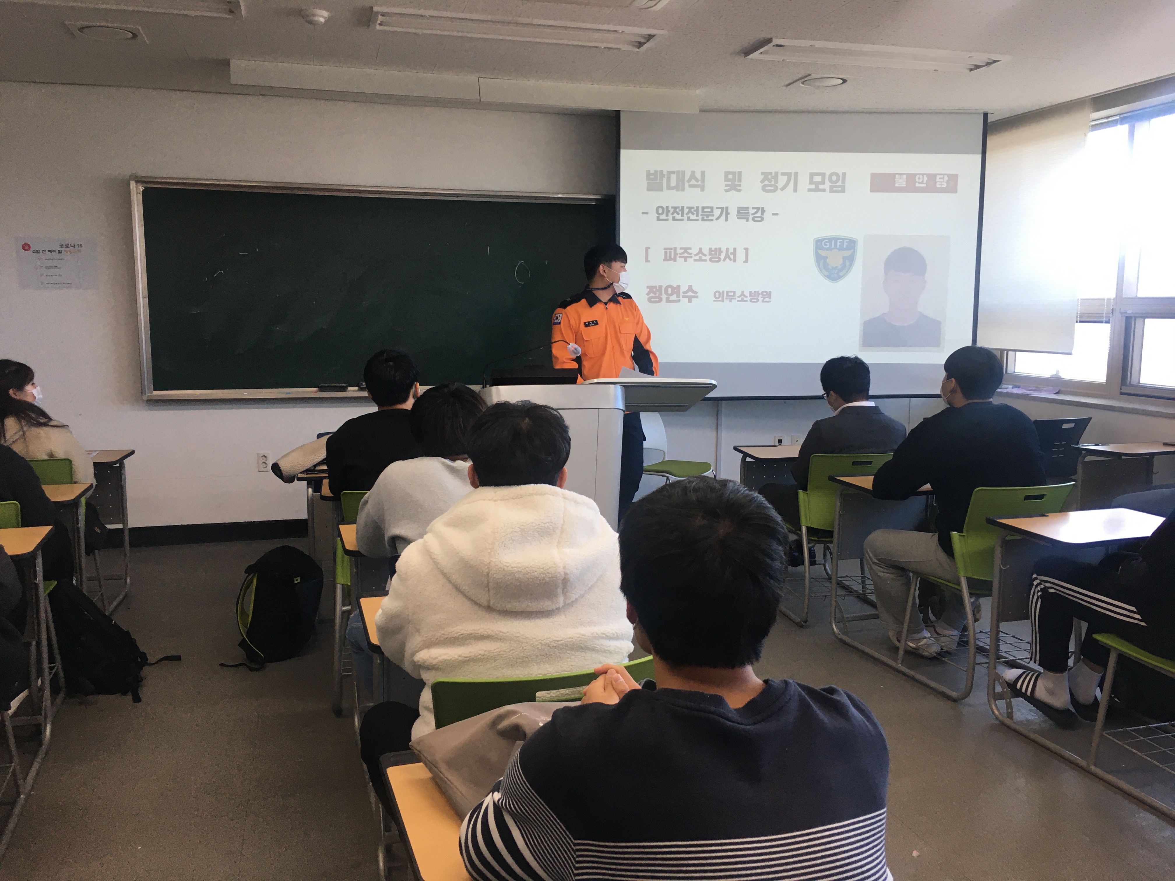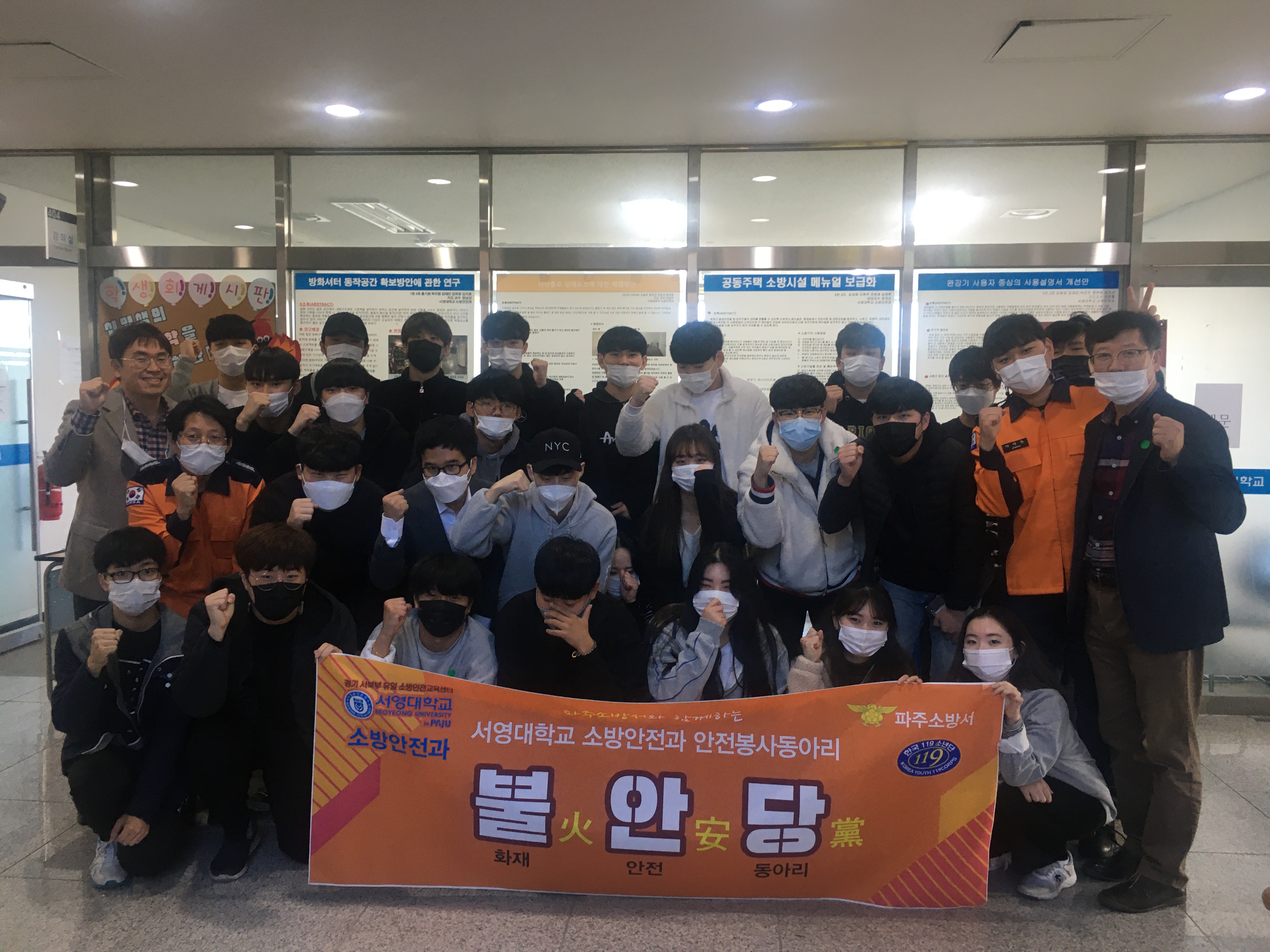o. 소방안전과 ( 학과장  천종철) 는 28일(수)  파주소방서 재난예방과 김진수 소방장 등 파주소방서 관계자 5명과 소방안전과 교수님과 학생등 30여명이 참석한 가운데  경기서북부 최초 대학부 소방안전 봉사단 "불안당" 창단식이 열렸다. 피주소방서측에서 이날  학생들을 위해 피자 및 다과등 푸한짐 다과등을 제공해 주며  불안당 창단을 축하해 주었다.