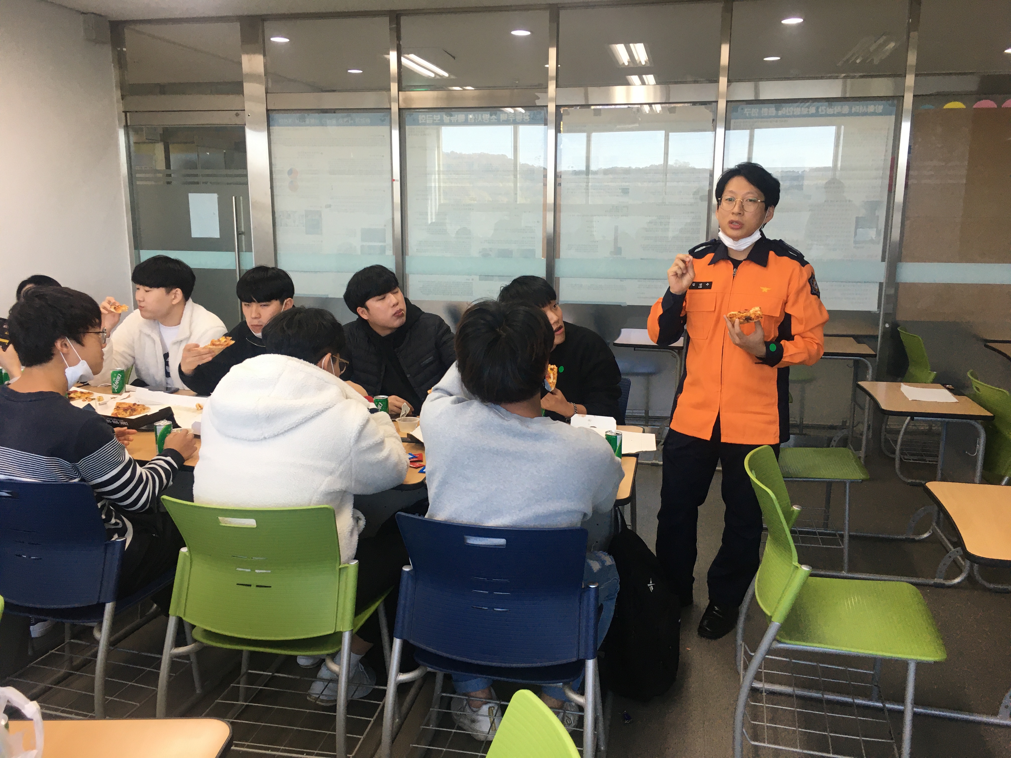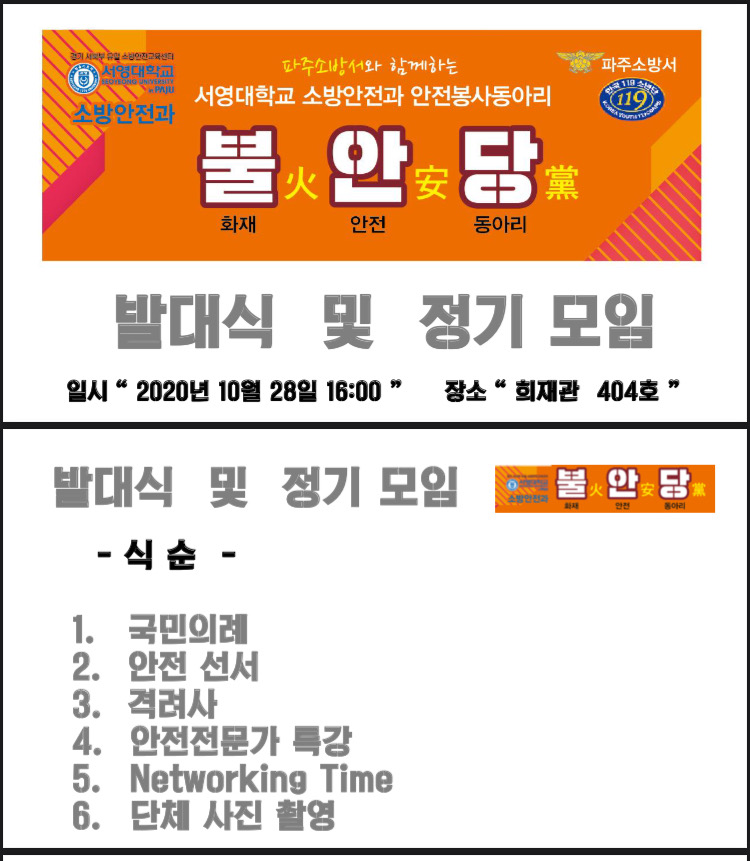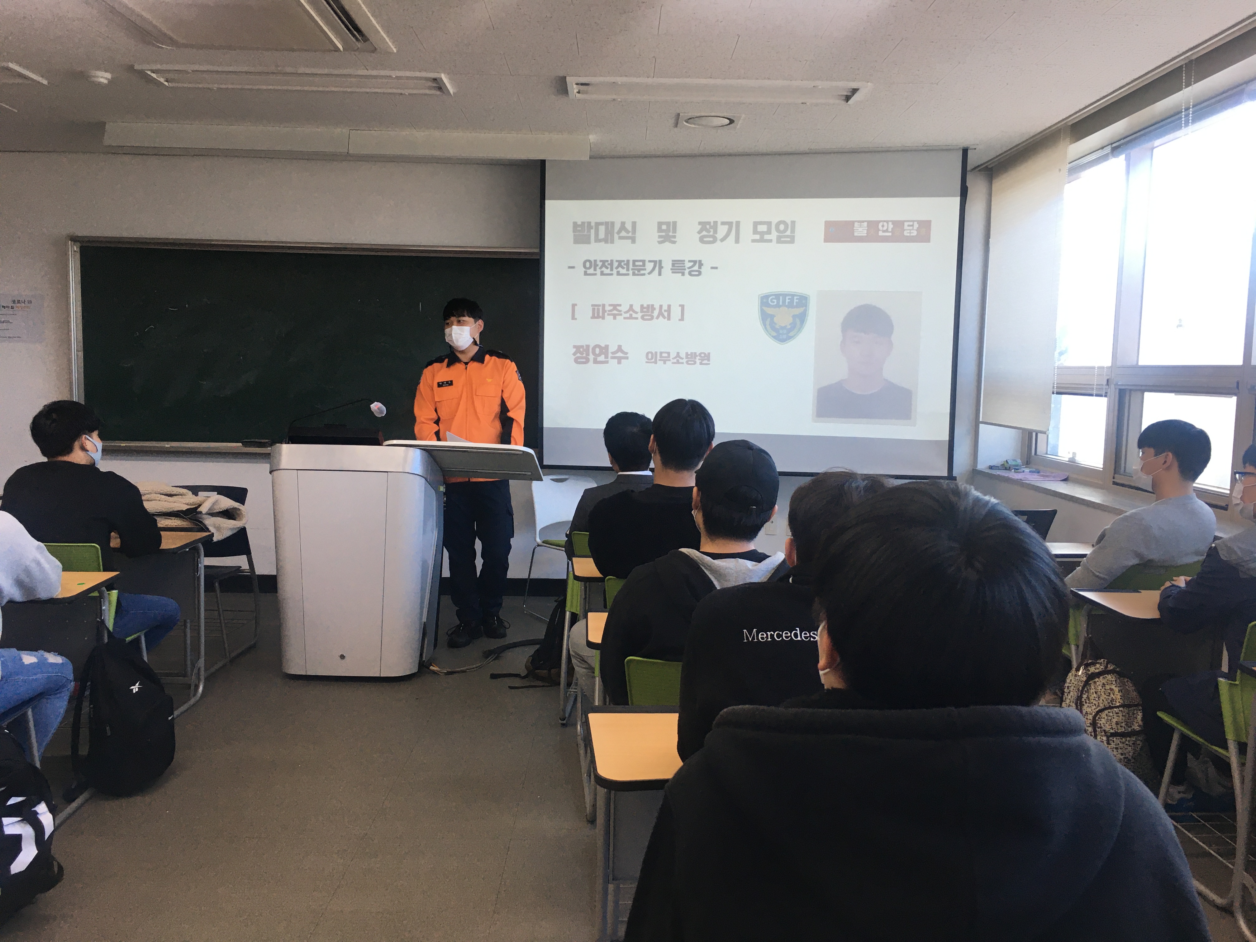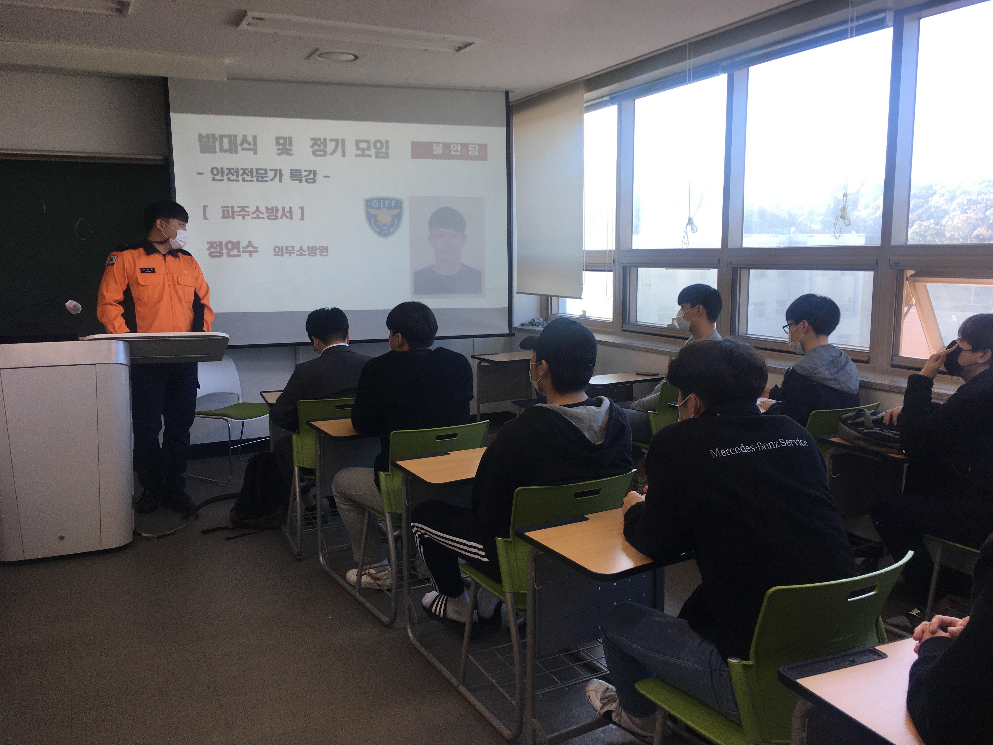 o. 소방안전과 ( 학과장  천종철) 는 28일(수)  파주소방서 재난예방과 김진수 소방장 등 파주소방서 관계자 5명과 소방안전과 교수님과 학생등 30여명이 참석한 가운데  경기서북부 최초 대학부 소방안전 봉사단 "불안당" 창단식이 열렸다. 피주소방서측에서 이날  학생들을 위해 피자 및 다과등 푸한짐 다과등을 제공해 주며  불안당 창단을 축하해 주었다.