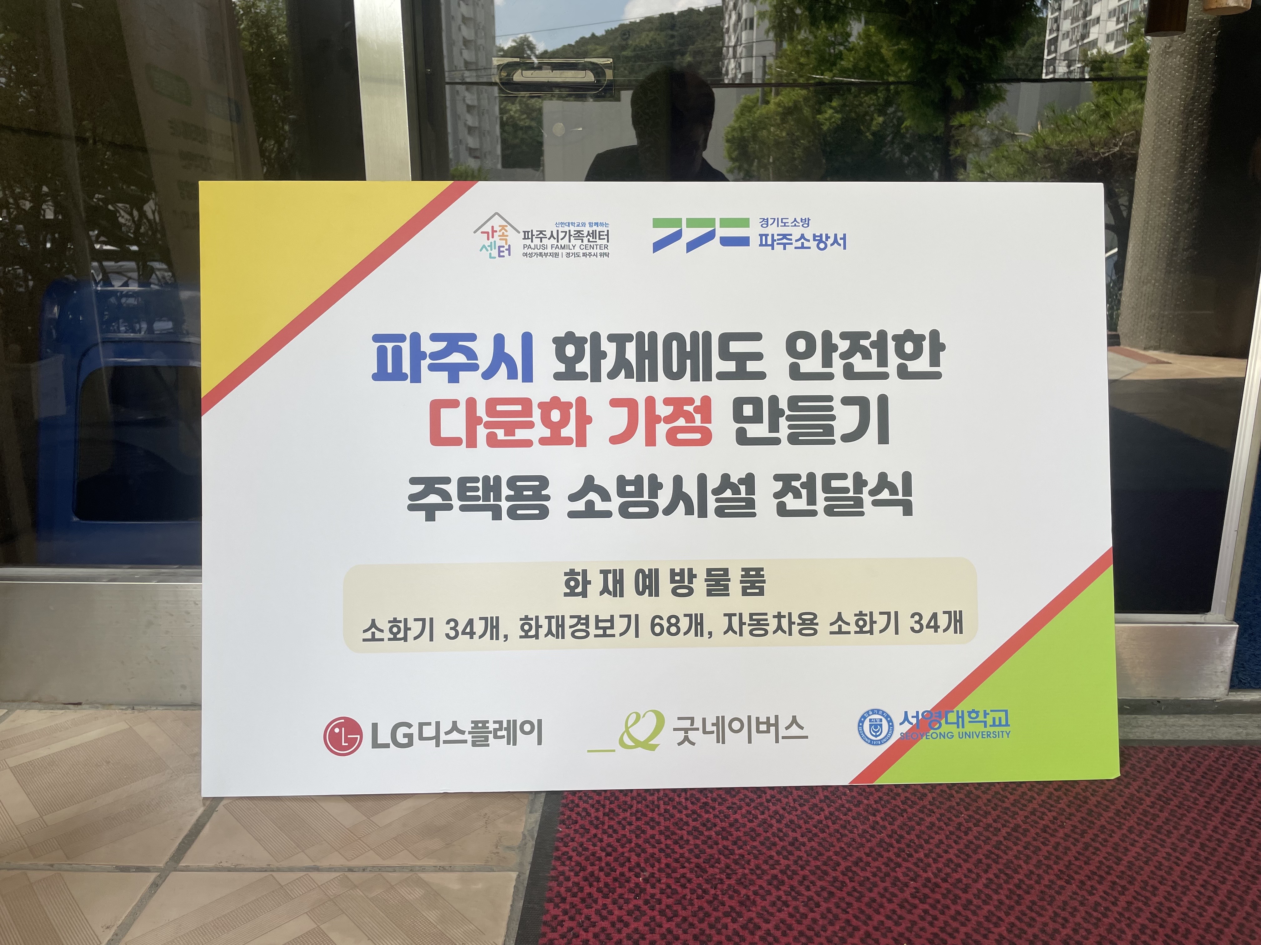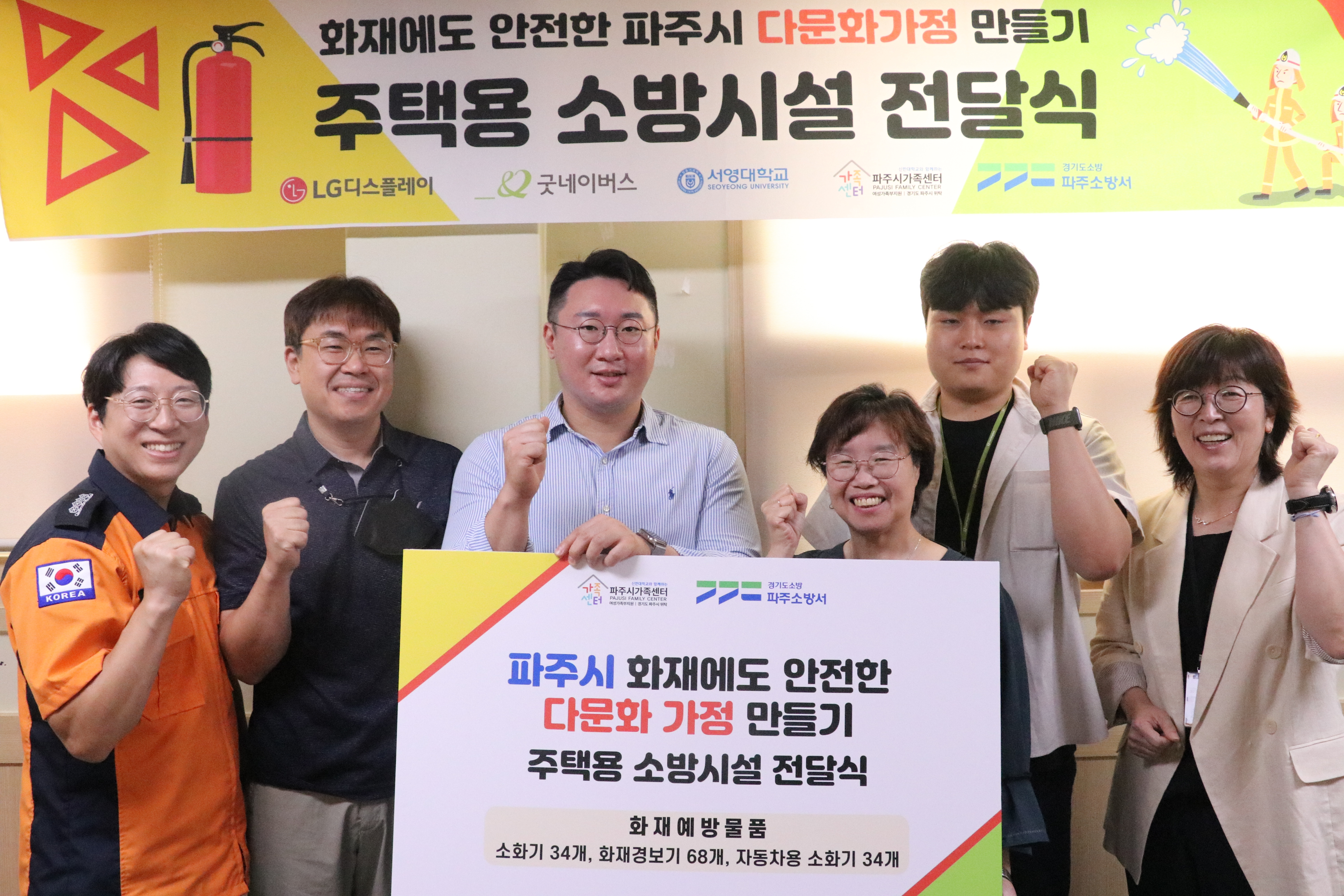 O.우리대학(총장 김정수)소방안전과(학과장 천종철)728()다문화가정을 위한주택용 소방시설 전달식에 참여하였다.파주시가족센터에서 진행된 행사는 파주시가족센터를 통한 다문화가정 소방안전 물품 보급을 위한 계획에 따라 파주소방서(서장 정찬영)와 굿네이버스, LG디스플레이 및 서영대학교 교수지원단이 함께 참여하였다.