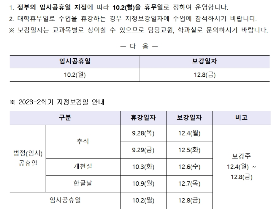 2023학년도 2학기 임시공휴일 및 지정보강일 안내
