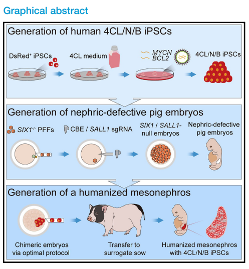 Wang and colleagues show that 4CL medium and MYCN/BCL2 overexpression generate human iPSCs with superior interspecies chimeric potential in pig embryos. This led to the successful formation of a humanized mesonephros in nephric-defective pig embryos via early embryo complementation, paving the way for growing a human kidney in pigs.