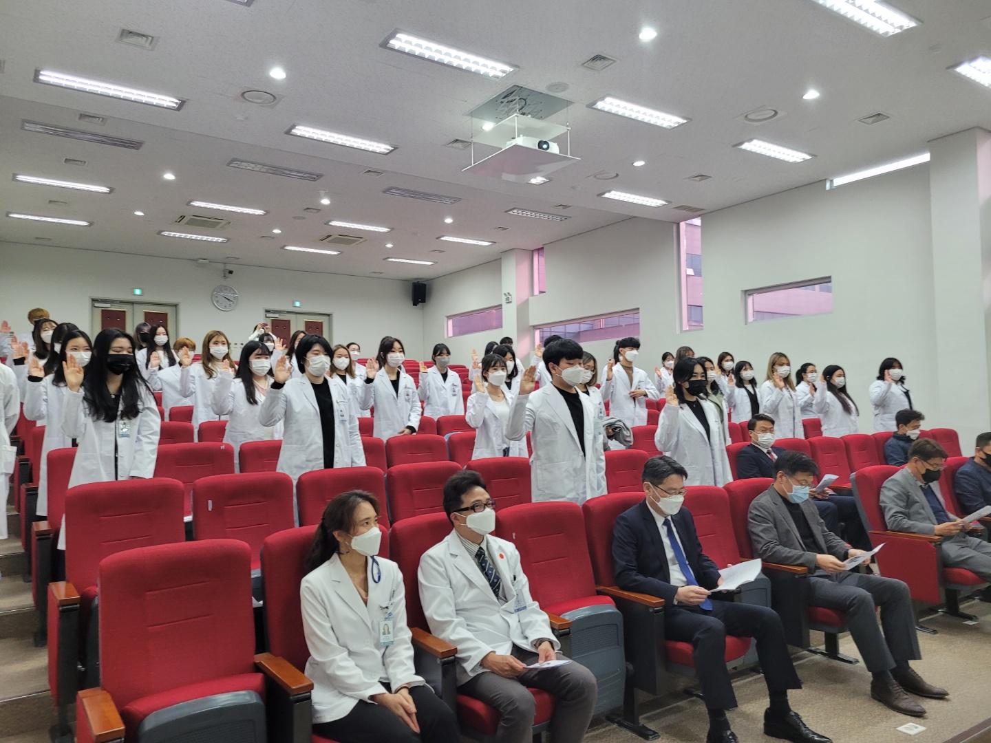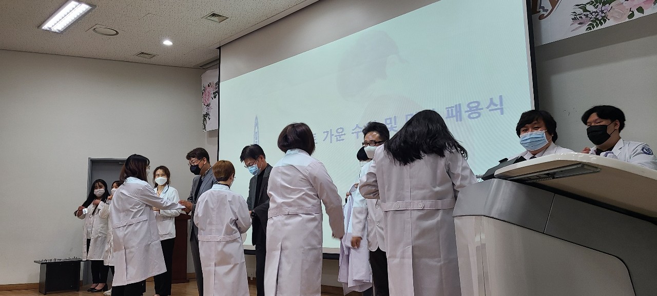 46명의 예비임상병리사는 각자의 이름이 새겨진 화이트 가운과 명찰을 수여받고, "임상병리사 윤리강령"을 낭독하며 박애와 봉사의 정신으로 국민건강에 이바지할 것을 다짐했다. 더불어 21학번 김준성 학생은 경기도 임상병리사협회의 장학생으로 선발되어 이광우 회장님으로부터 장학증서를 수여받았다.