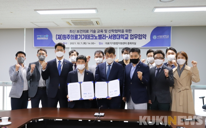 서영대학교 파주캠퍼스(부총장, 김순곤)와 원주의료기기테크노밸리(원장 김광수)가 7일 의료기기종합지원센터(강원도 원주시 소재)에서 4차 산업혁명 시대를 이끌어 갈 신산업분야 전문기술인재 양성과 의료기기산업 경쟁력 강화를 적극 도모하기 위해 업무 협약을 체결했다.