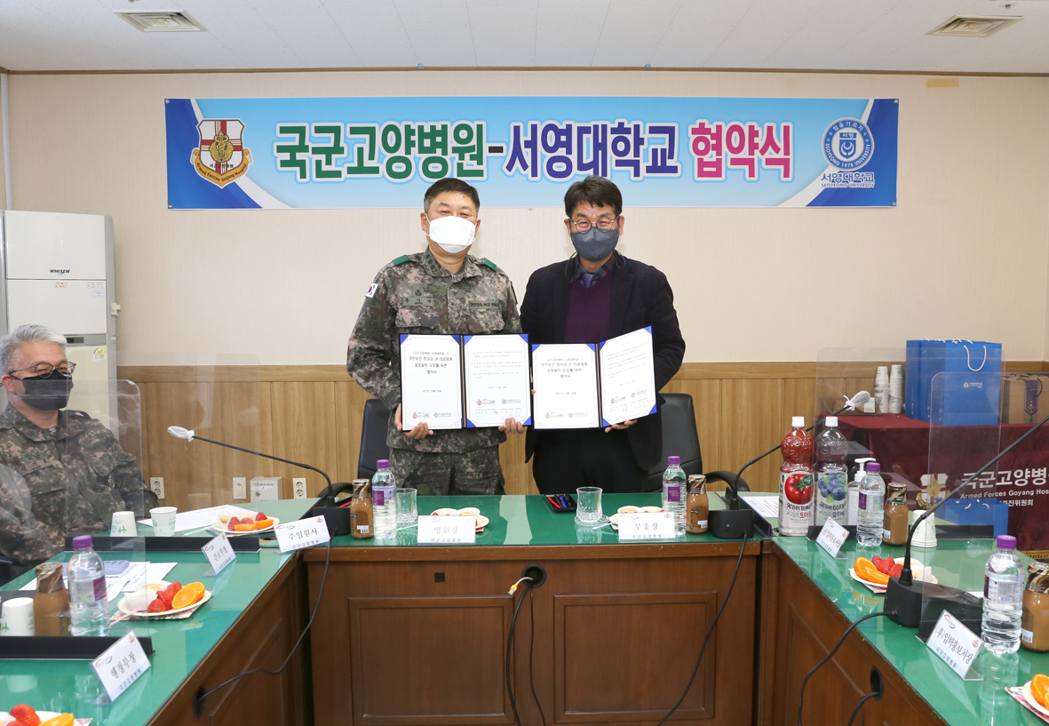 지난 12월 28일, 우리대학 (총장 김정수)은 국군고양병원 (병원장 홍기태)과 장병 및 국민보건향상과 연구 및 교육의 상호 협력, 선진 군 의료체계 공동발전을 위해 상호 업무협약을 체결하였다. 협약식은 국군고양병원 회의실에서 진행 되었으며, 김순곤 서영대학교 부총장, 장동민 입학홍보처장, 장철인 학생취업처장, 이명선 치위생과 학과장, 이지웅 임상병리과 학과장, 홍보경 보건의료행정과 학과장, 서권홍 홍보기획팀장 등 서영대학교 관계자와 홍기태 병원장, 이인섭 인행과장, 군의관 등 국군고양병원 관계자 등 20여 명이 참석하였다.