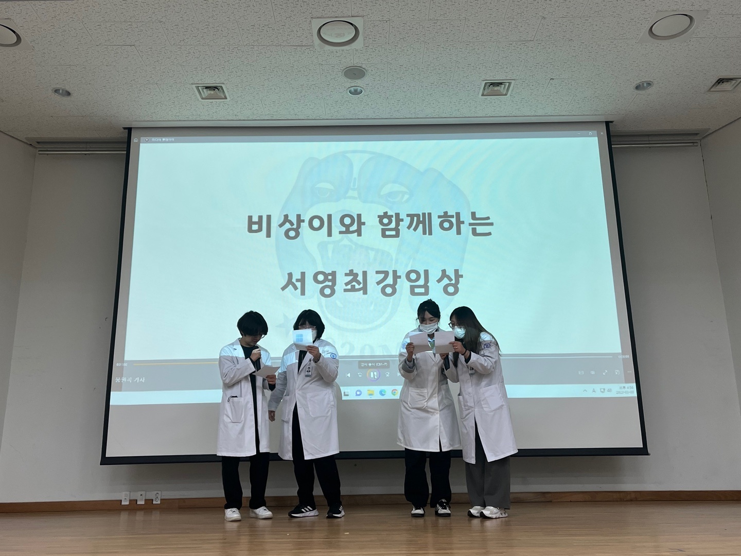또한 1학기에 진행될 예정인 학과프로그램 (연합MT, 피트니스 헌혈캠페인, 프런티어진단의과학세미나 등)들에 대한 소개와 더불어 비상이와 함께 학과응원곡을 불러보고 익히는 청음회를 진행했습니다. 학과교수진과 학생들이 함께 응원곡을 부르며 최강임상인이 되었음을 실감하는 순간이었습니다.