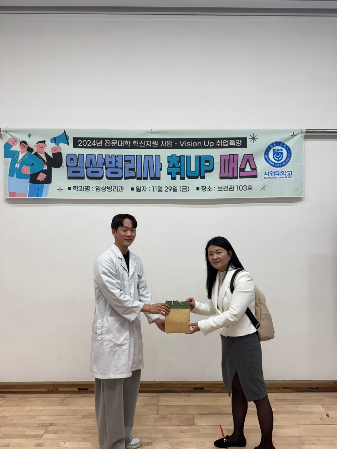 멘토링 시간을 통해 재학생들의 많은 질문에 대한 멘토님의 따뜻한 조언이 이어졌고, 학생들은 다양한 분야에서 활동 중인 임상병리사의 역할과 진로 선택에 대한 구체적인 방향을 제공받을 수 있었습니다. 특히, 비의료기관 스타트업에서 임상병리사가 어떤 가치를 더할 수 있는지 실질적인 정보를 얻는 소중한 시간을 보냈습니다. 마지막에 학생들은 감사의 뜻으로 멘토님께 작은 선물을 전달하였습니다.