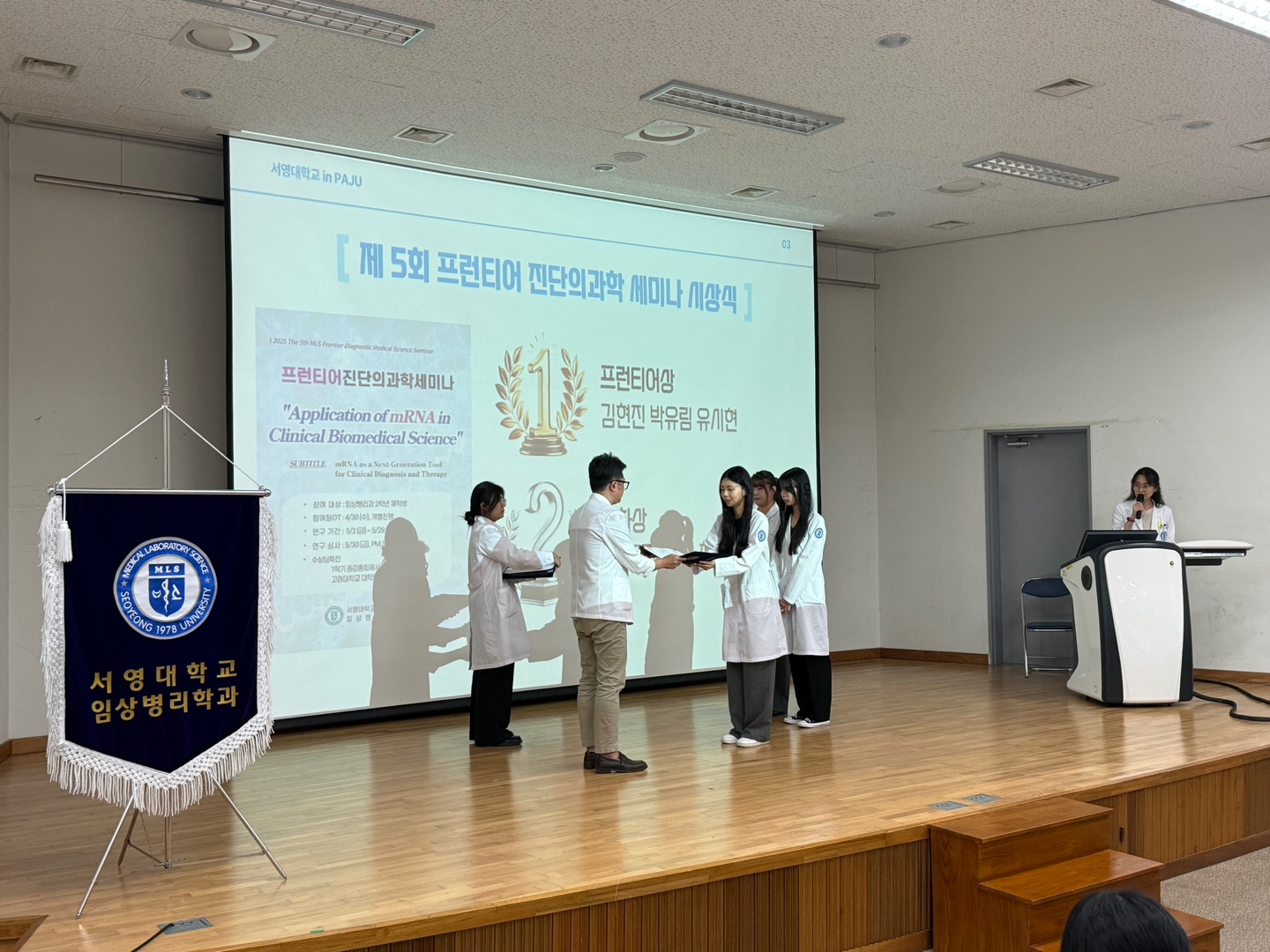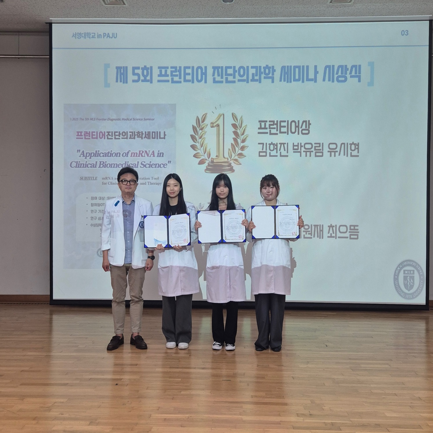 이번 종강 총회에서는 제 5회 프런티어진단의과학세미나에서 최고 점수를 획득한 24학번 김O진, 박O림, 유O현학생의 "프런티어상" 상장과 상금이 수여되었고, 한 달 간의 대학원 인턴십 참여 기회도 제공되었다. 두번째로 높은 점수를 받은 24학번 신O련, 최O재, 최O뜸 학생이 "아차상" 상장과 상품을 수상하였고, 제주도에서 열리는 국제학회(한국진공학회)에 참석할 수 있는 기회도 함께 주어졌다. 상장 수여식 후, 우승팀의 연구 내용을 공유하는 공개 발표 시간도 진행되었다.