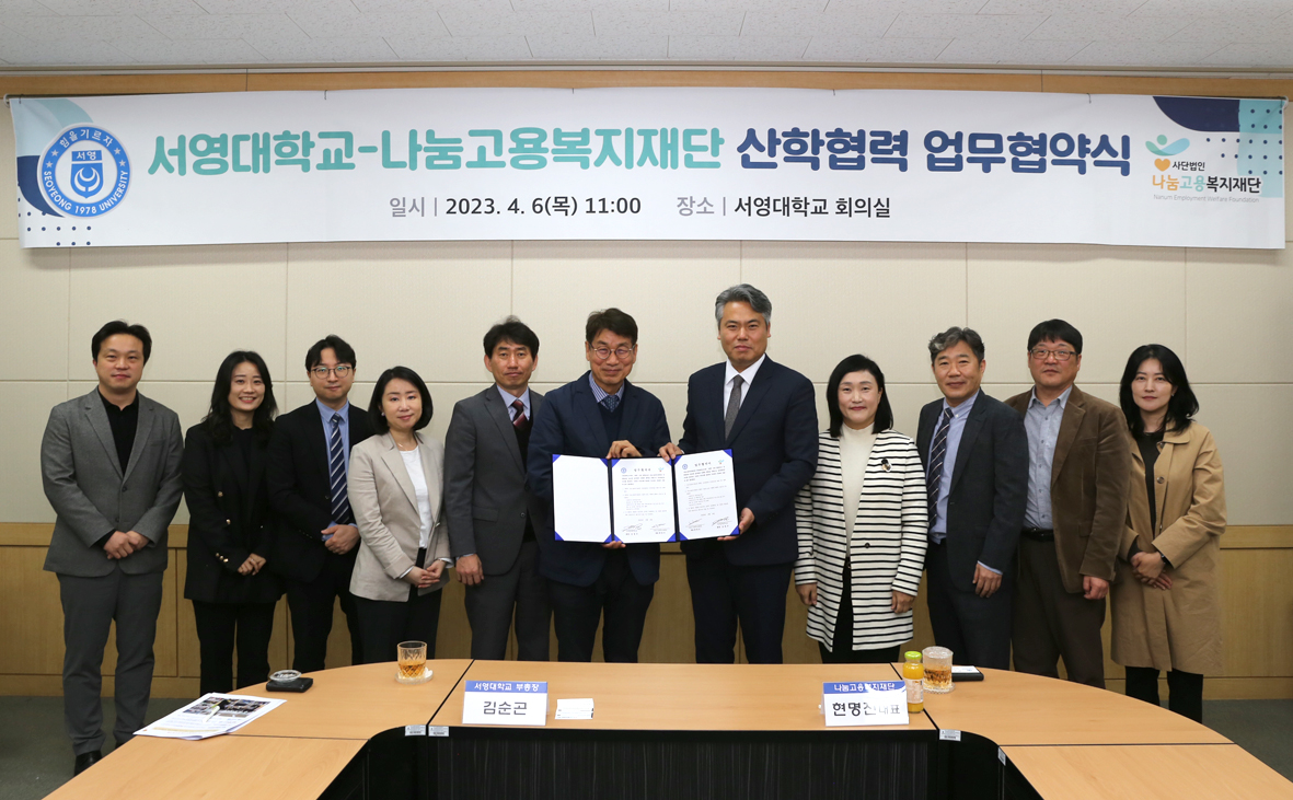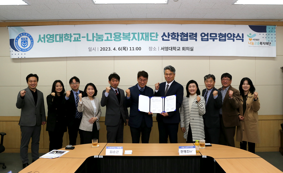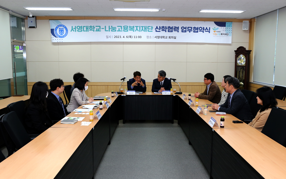 우리대학(총장 김정수)은 사회복지행정과(학과장 김효선)는 4월 6일(목) 나눔고용복지재단(이사장 현명진)과 유기적인 상호협력체계 구축을 위한 업무협약을 체결하였다. 서영대학교 회의실에서 진행된 협약식은 서영대학교 부총장 김순곤, 학생취업처장 김명재, 사회복지행정과 학과장 김효선, 사회복지행정과 권지혜, 김민철 교수 등 서영대학교 관계자와 나눔고용복지재단 이사장 현명진, 이사 전영석, 나눔평생교육원장 손용민, 고산종합사회복지관장 장재임 외 재단 관계자등 총 10여명이 참석하였다.