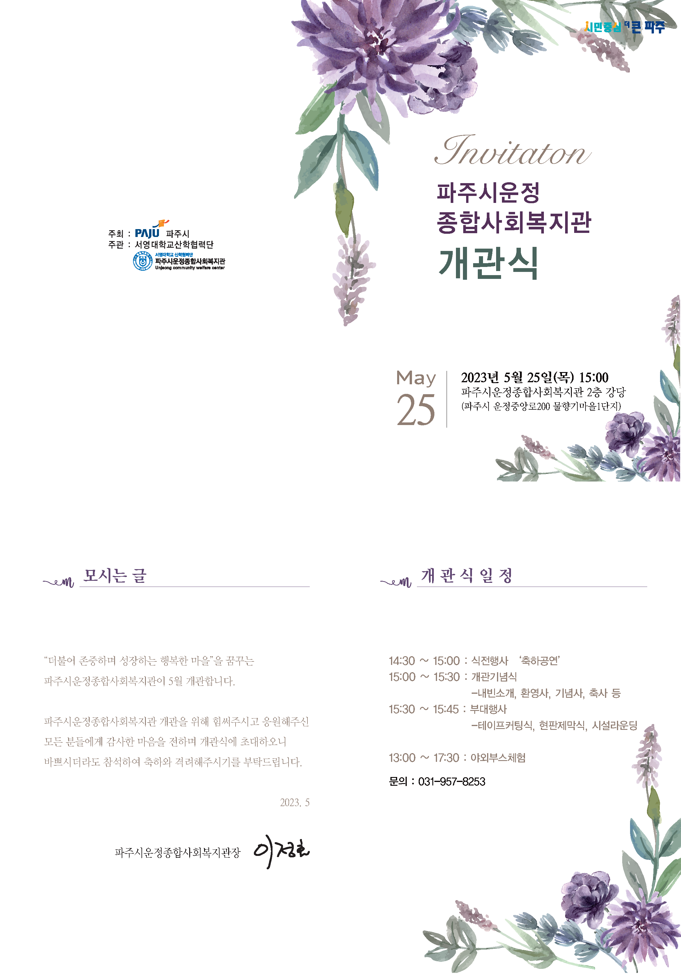 파주시운정종합사회복지관 출범에 많은 관심과 응원을 부탁드립니다.