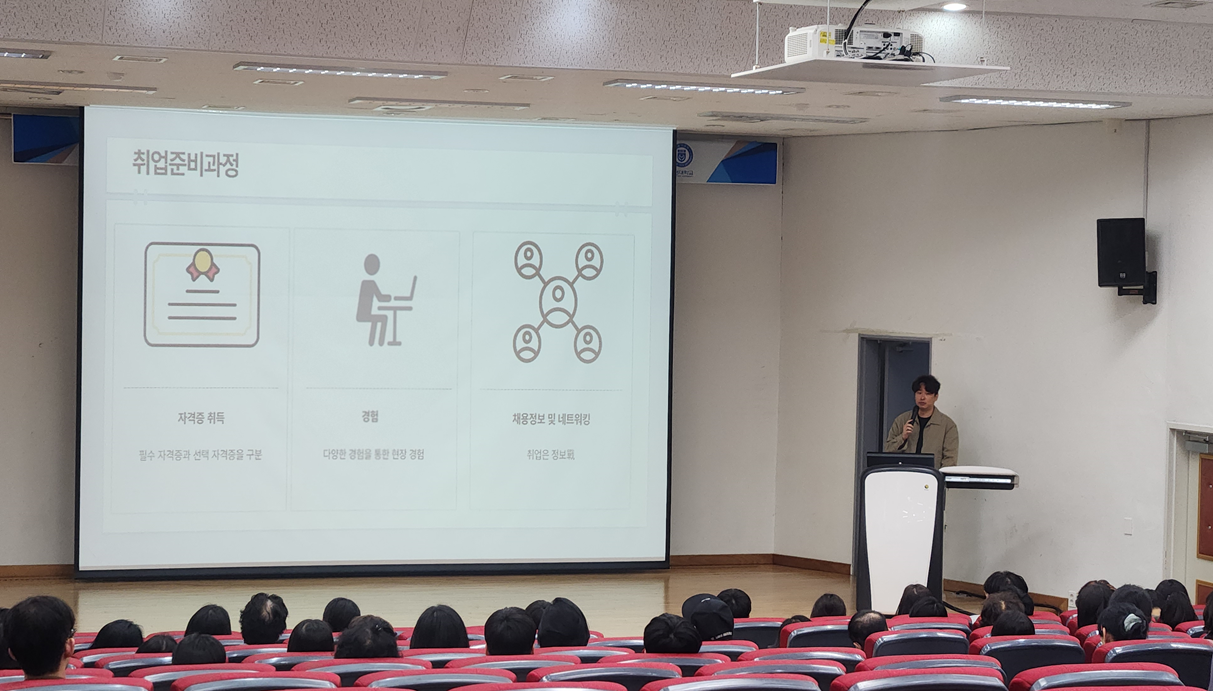 특강에서는 이력서 및 자기소개서 작성 요령, 면접 준비 방안 등 취업 준비생들에게 꼭 필요한 내용이 다뤄졌으며, 1~3학년 재학생 약 60여명이 참여하였습니다.