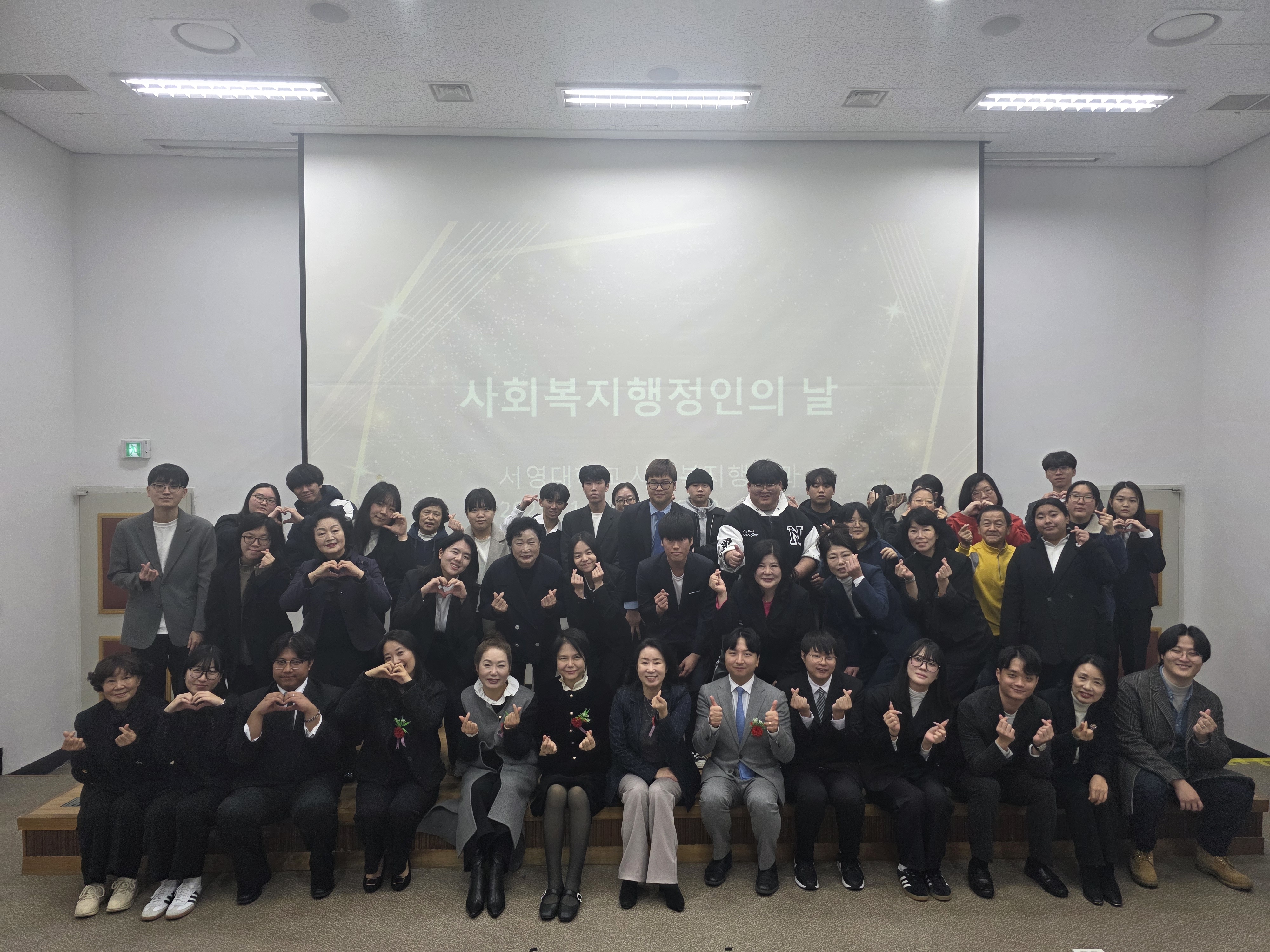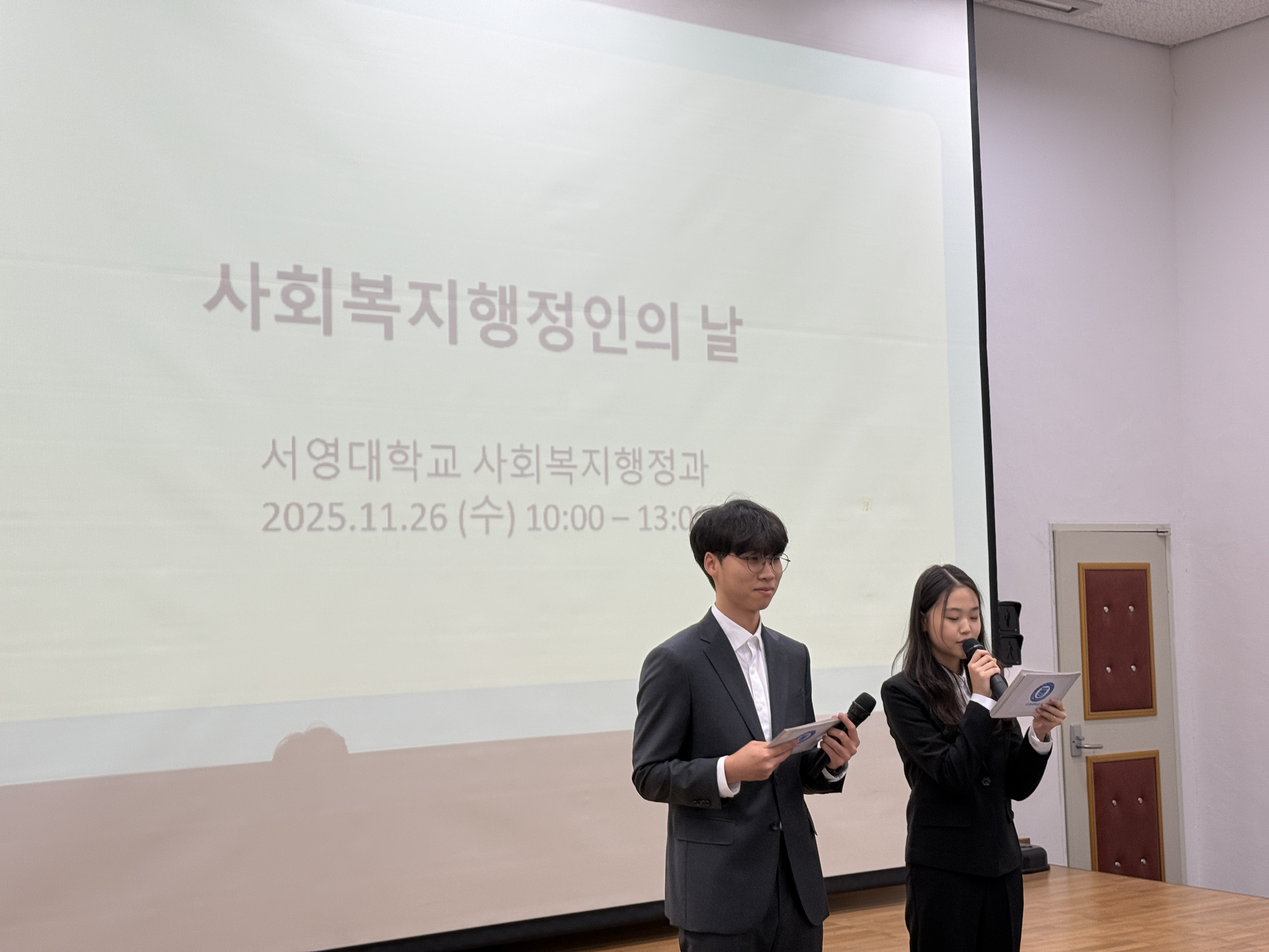 2025년 11월 26일(수) 서영대학교 파주캠퍼스 서영홀에서 <사회복지행정인의 날> 행사가 개최되었습니다. 이번 행사에서는 교수님들께 감사의 마음을 전하는 시간을 비롯하여 2학년 예비 졸업생들의 사회복지·보육 실습 발표, 자격증 수여식, 외부대회 시상 등 다양한 행사가 진행되었습니다. 귀한 시간을 내어 참석해 주신 교수님들 덕분에 더욱 뜻깊은 자리가 되었으며, 재학생 약 60명이 함께하여 자리를 더욱 빛내주었습니다.