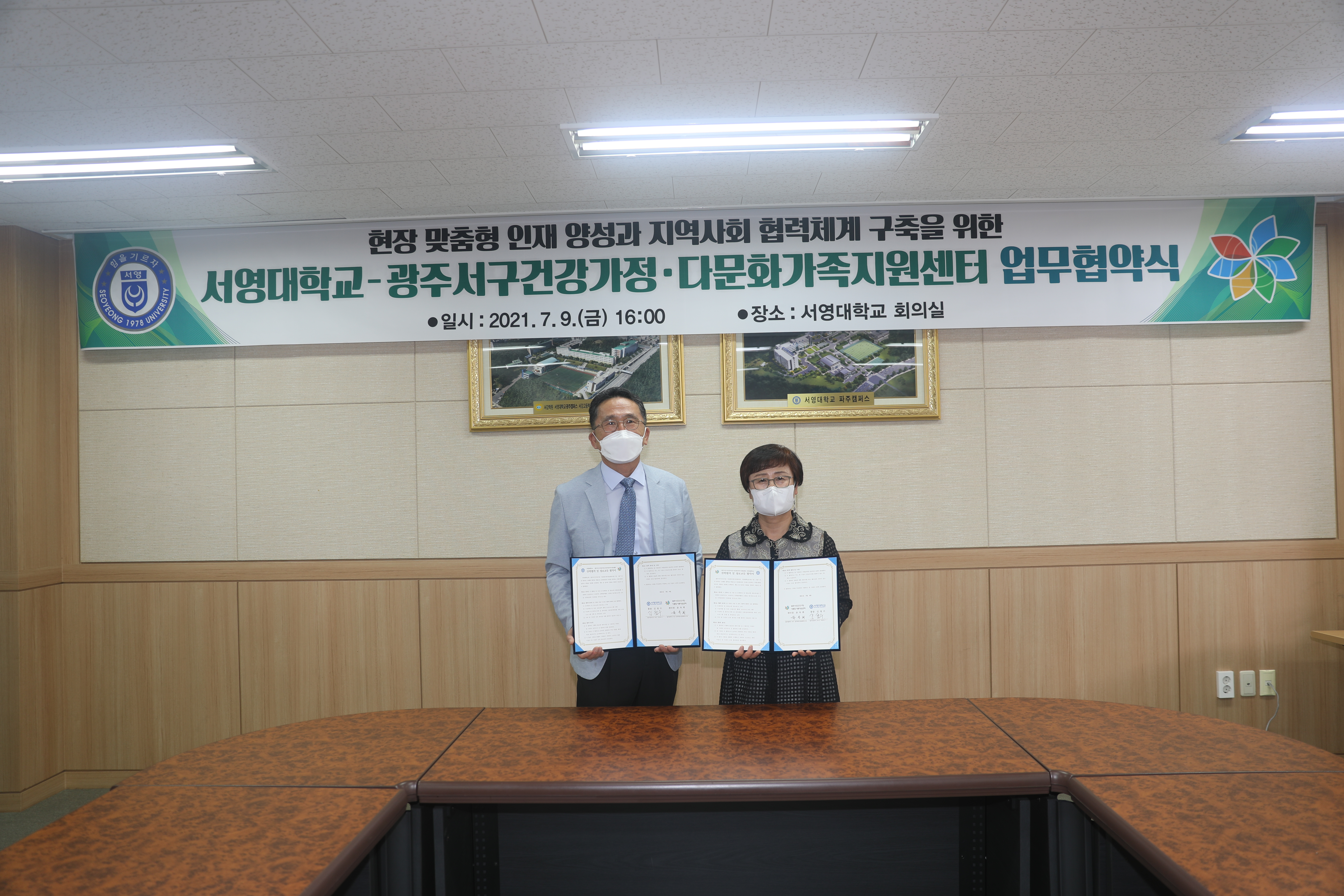 2021년 7월 9일, 서영대학교와 광주서구건강가정, 다문화가족지원센터와 업무협약식을 가졌습니다. 이번 협약식을 통해 서영대학교 사회복지과와 뷰티미용과는 현장 맞춤형 인재 양성을 위한 긴밀한 관계를 맺기로 했습니다. 이번 협약을 통해 우리 사회복지과 학생들의 관련 역량의 신장을 기원합니다.