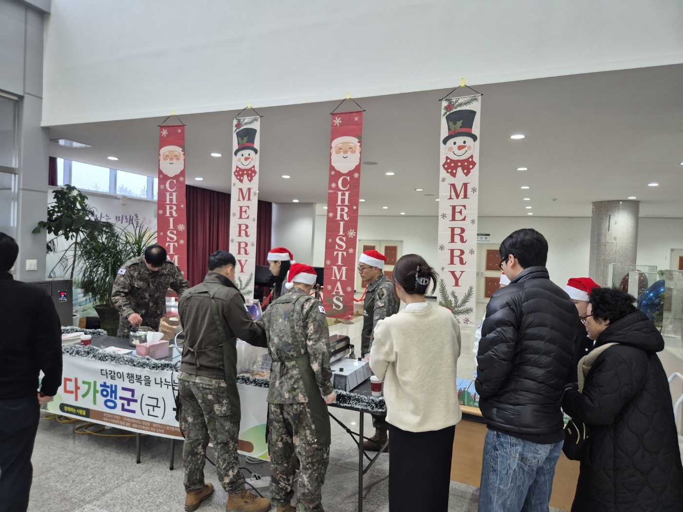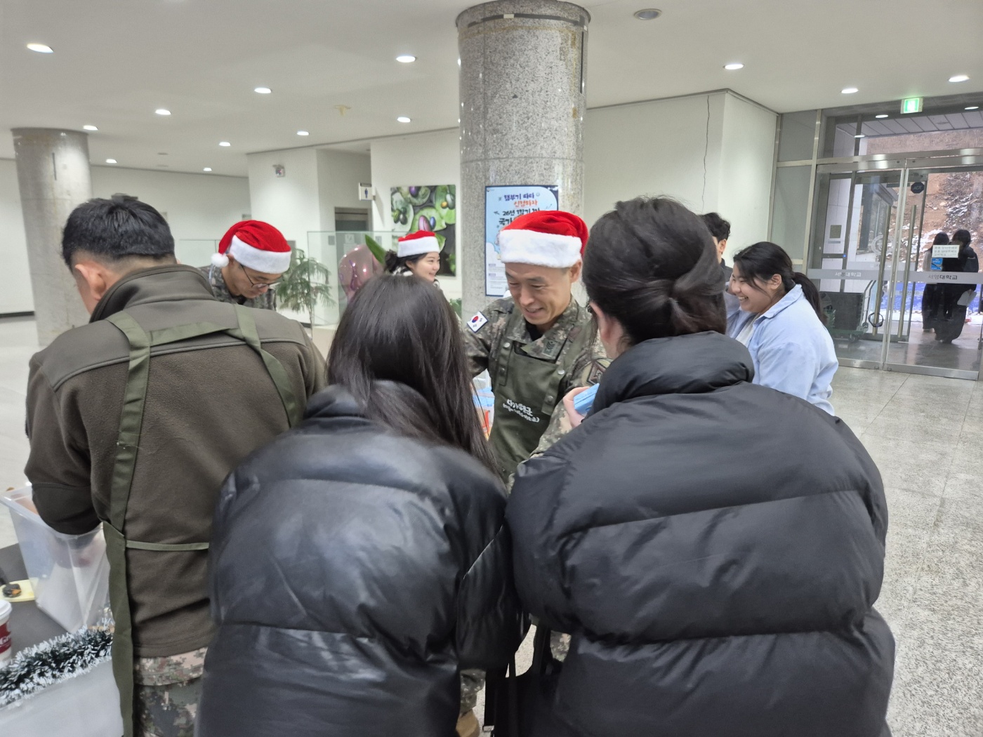 ○ 우리대학(총장 김정수)은 재학생들의 학업 응원을 위해 12월16일(화) 제2기갑여단 군 봉사동아리 '다가행군'과 함께 붕어빵 나눔행사를 진행하였다. 서영관 로비에서 진행된 붕어빵 나눔이벤트는 기말고사를 앞두고 학업에 매진하고 있는 재학생들에게 따뜻한 응원의 마음을 전하고자 마련된 행사이다. 제2기갑여단 군 봉사 동아리 '다가행군' 소속 간부들은 직접 붕어빵을 구워 학생 및 교직원에게 나누며 추운 날씨 속 온기를 전했다.